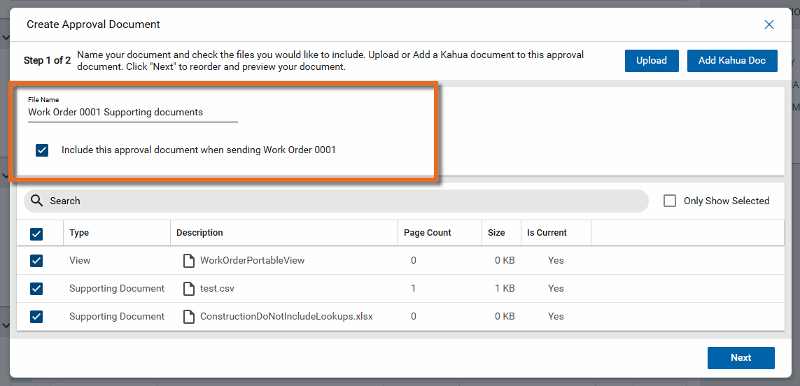 Select the files to include in the approval doc by clicking the check box next to the appropriate files. To only include the original document, select the "View" file.