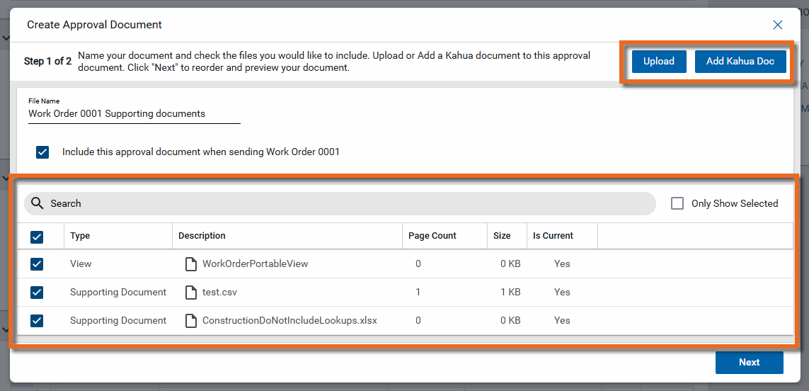 Any additional reference files from the record also appear. You can add additional files from your computer by selecting Upload, or select Add Kahua Doc to add existing documents from the File Manager app.