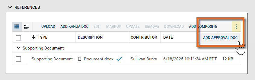 In the References section, select Add Approval Doc. You may need to click the More icon