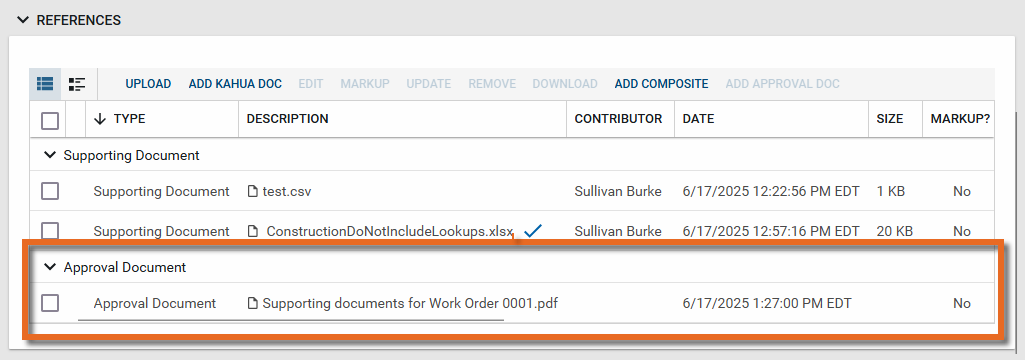 Once you are satisfied with the order, click Complete. The new document with the assigned file name appears in the record's References section under the Approval Document grouping.