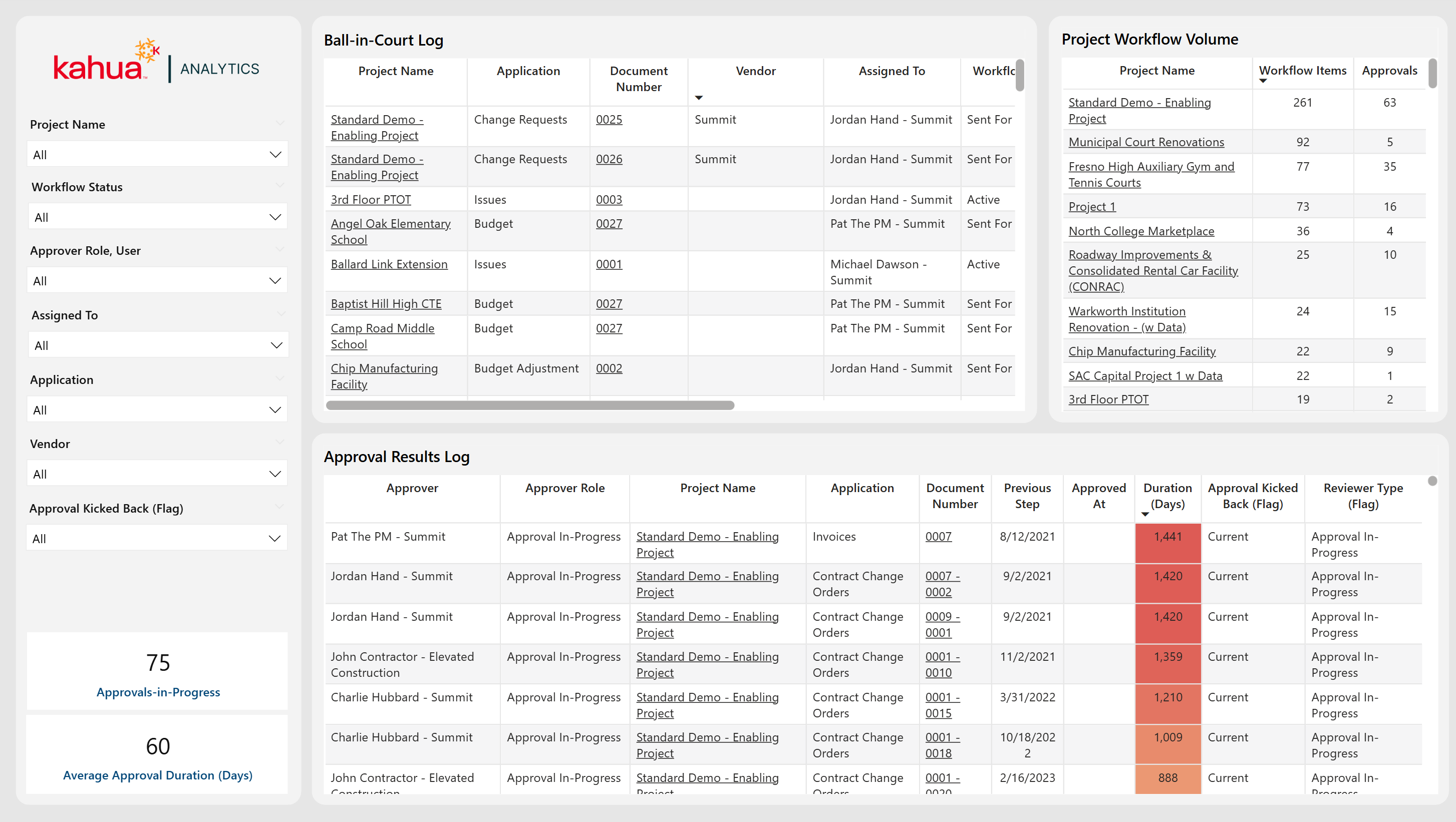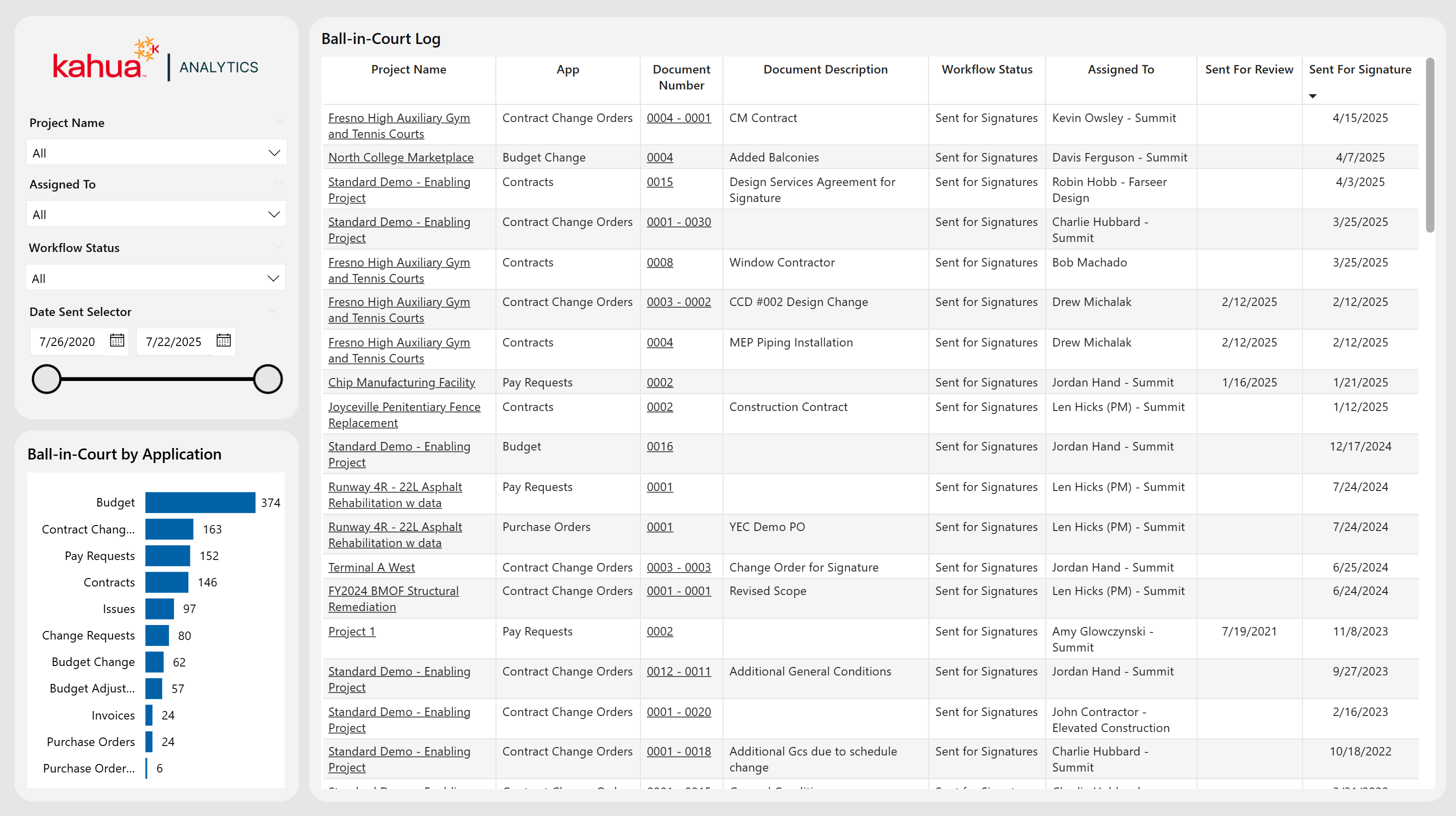 The Workflow Status Log Dashboard captures all items across a variety of Kahua Cost and Funding apps that go through an approval process. It also shows who currently owns each task as their ball-in-court item. Furthermore, it displays the high-level count of work flow items for users per app. Through filtering by status, project name, date sent, and the team or individual the item is assigned to, project managers and team members can quickly pinpoint stalled items and track accountability for reviews. This way, they can maintain a timely approval pipeline.