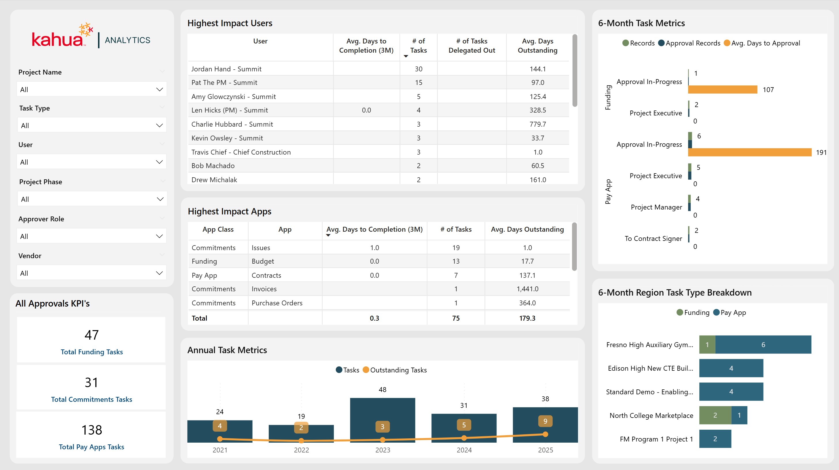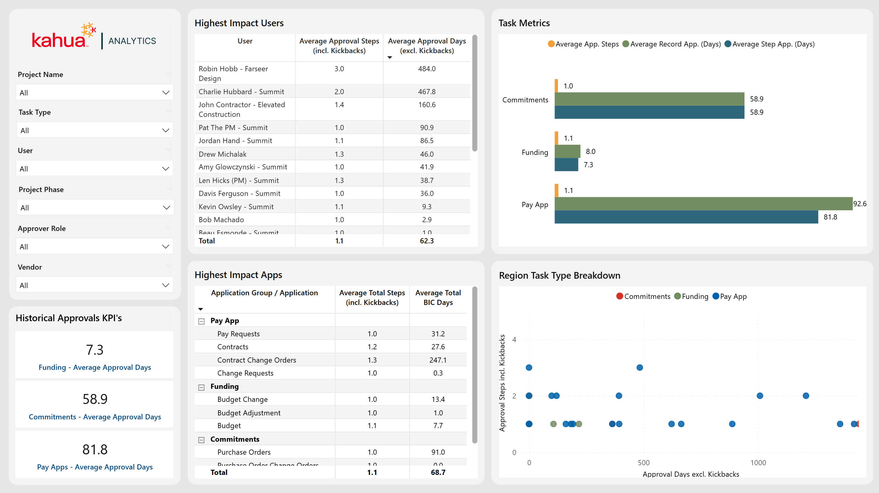 The Historic Approvals Dashboard analyzes past approval processes to uncover patterns in both user and application performance. While the All Approvals dashboard shows data on both approved items and approvals-in-progress, this dashboard focuses solely on approved items. Filters allow users to look into specific projects, phases, roles, or vendors, while the visualizations depict average approval steps, durations, and task-type distributions.