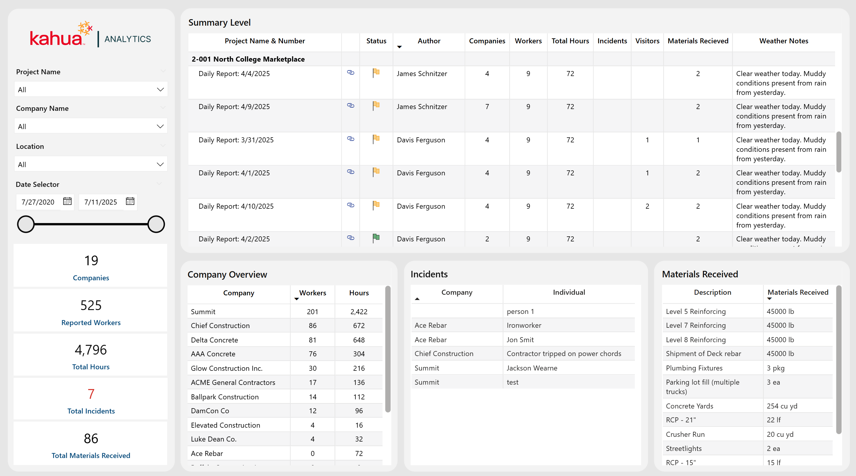 This dashboard logs critical daily site information – from labor and hours to incidents and material deliveries – complete with status and workflow insights. The Companies, Incidents, and Materials Received tables automatically filter according to the project or report selected in the top visual and provide granular details.