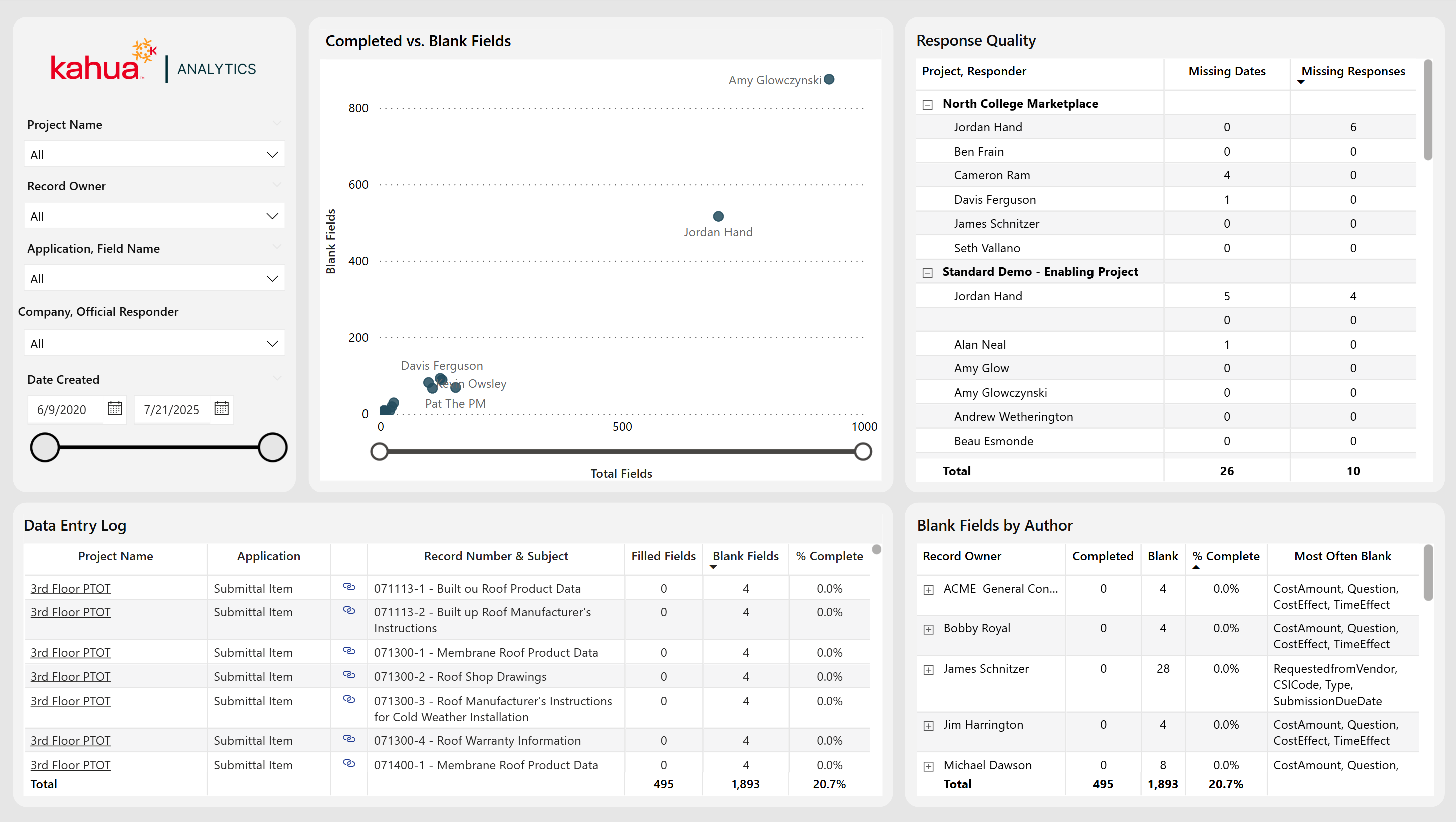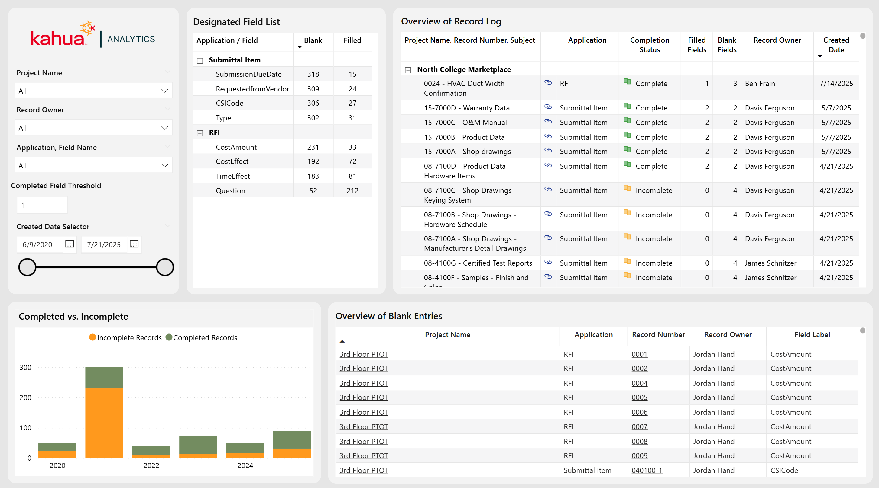 The Data Entry Dashboard provides a record-centric view of all RFI and Submittal documents, enabling users to efficiently audit entries across their portfolio. While the current implementation focuses on RFIs and Submittals, the dashboard is designed to be scalable and can be extended to other applications upon customer request. A key feature of the dashboard is the ability for users to define the number of required fields that must be filled out for a record to be considered "Complete." This configurable logic allows organizations to tailor the dashboard to their unique business needs and workflows. In addition to this functionality, users can use this dashboard as a navigational tool to edit records and find gaps in data quality.
