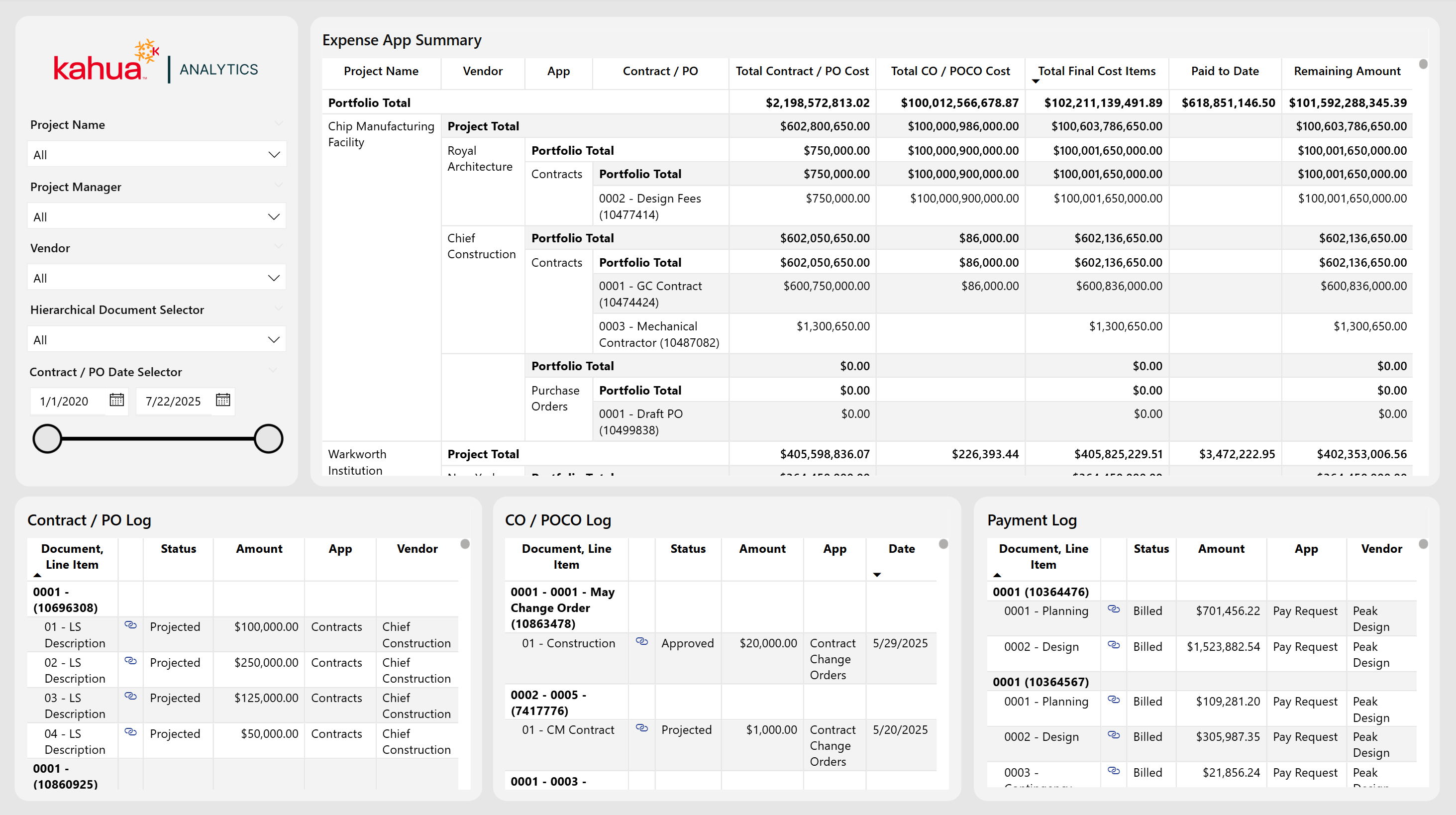 This dashboard features a visualization organized by project, vendor, expense app, and the specific expense document's name. It displays total costs including change orders, amount paid to date, and amount remaining to pay. Three logs at the bottom break out Contracts / POs, Change Orders / POCOs, and Payment entries. From these logs, users can view details about their status and costs at an individual document level.