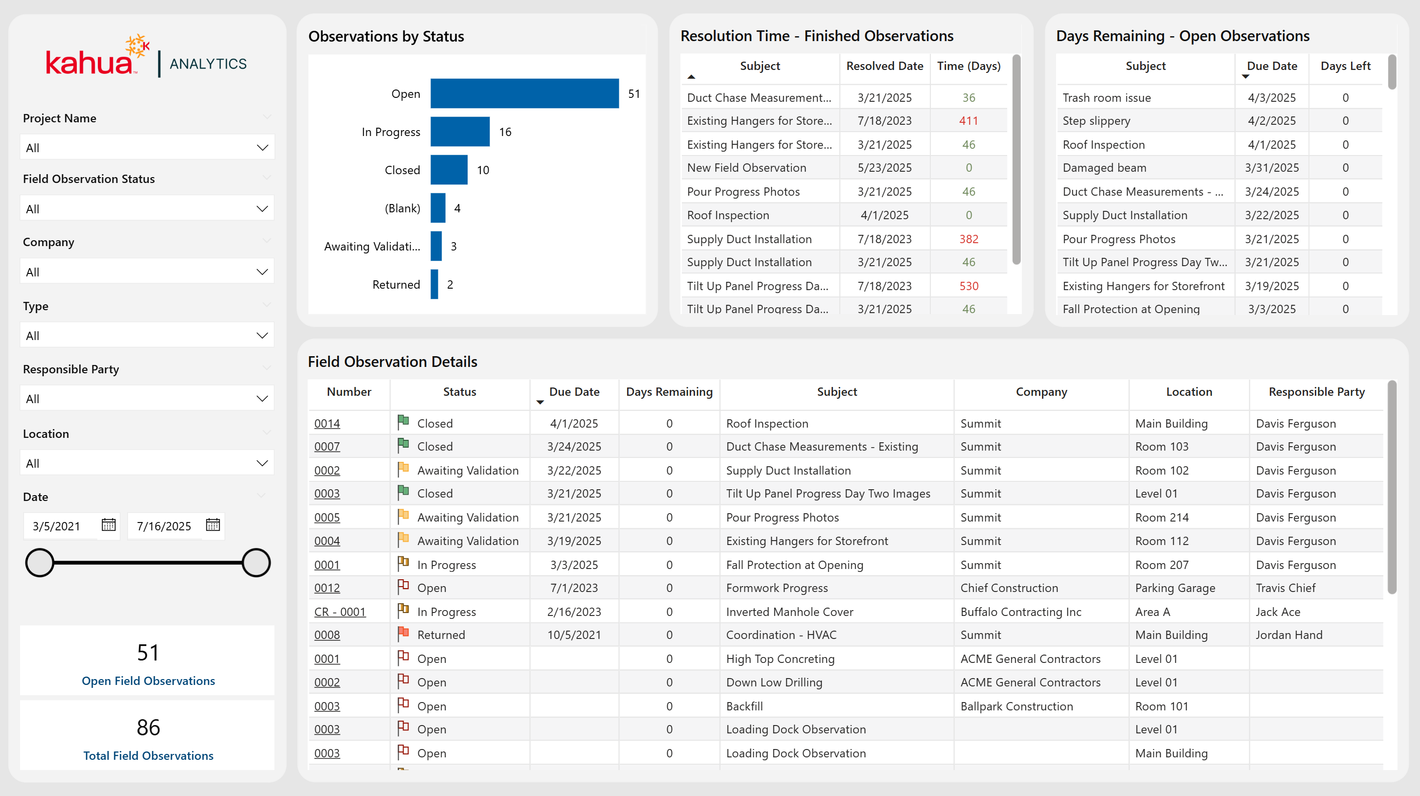 The Field Observations Dashboard provides an organized framework for tracking on-site issues, as well as capturing critical details such as observer, location, and status. Through various visuals, teams can monitor observations by status, spot upcoming due dates, and review how quickly issues resolved.