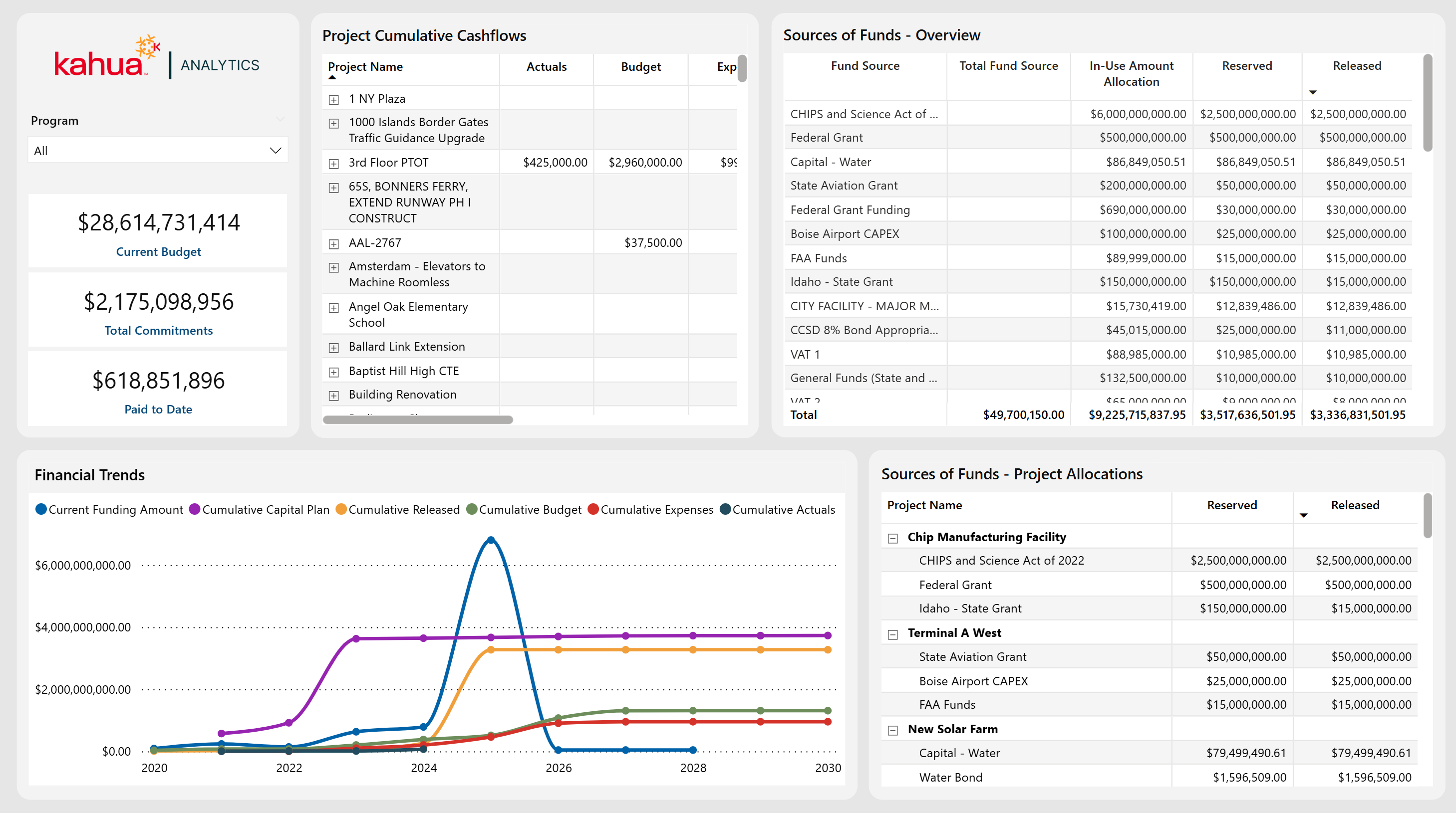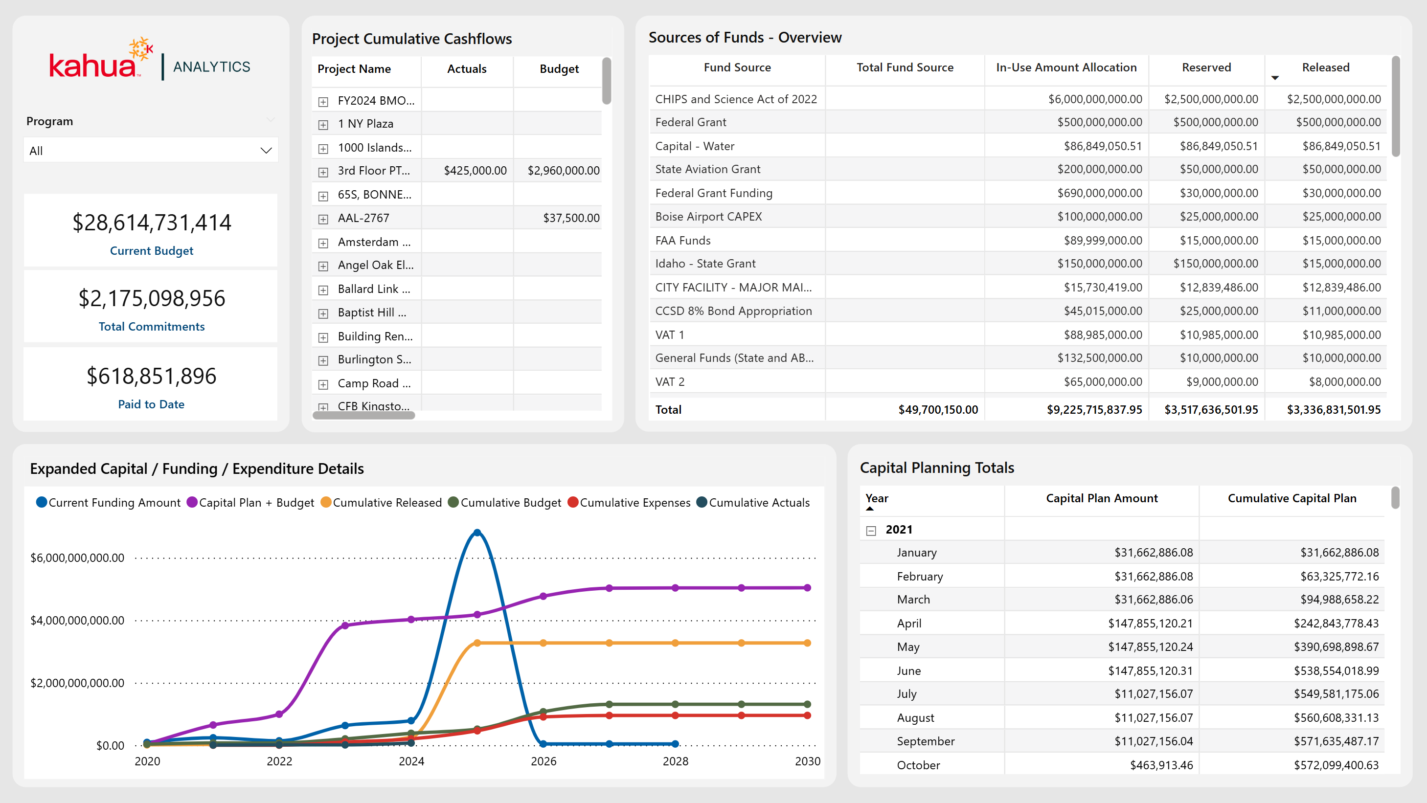 With the ability to switch between multi-program and program-specific views, this dashboard presents timeseries graphs of capital plans, funding sources and releases, budgets, expenses, and actuals - all in one place. A detailed financial breakdown across multiple apps helps users identify potential surpluses or funding gaps and adjust allocations proactively.