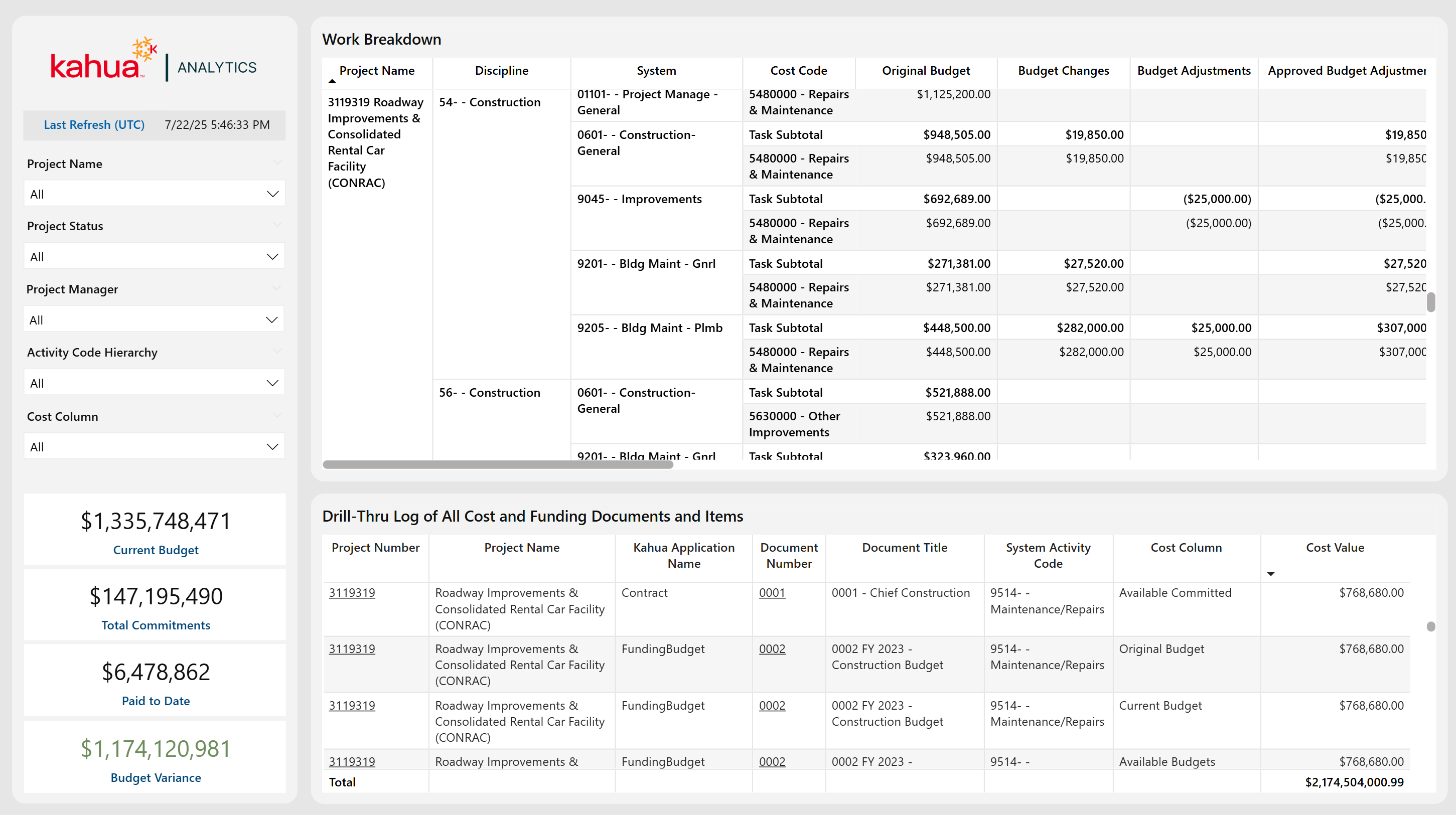 With an expanded primary visualization, as well as clear total budget forecasting, this dashboard allows users to monitor program finances at a glance. This way, they can easily identify any gaps or surpluses that may occur well in advance. Owners gain the flexibility to either pursue new initiatives confidently or take corrective steps before costs exceed available funding.