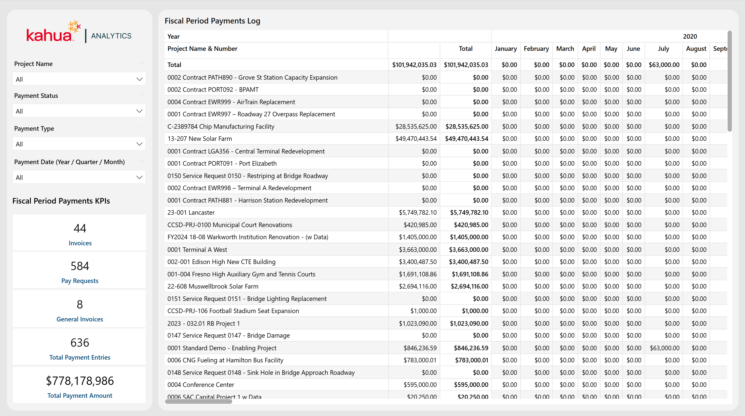 This dashboard displays total payments over specified fiscal periods, highlighting annual totals of all payments. It also displays the designated KPIs across all projects. These KPIs include the number of invoices, pay requests, general invoices, total payment entries, and overall total payment amount.