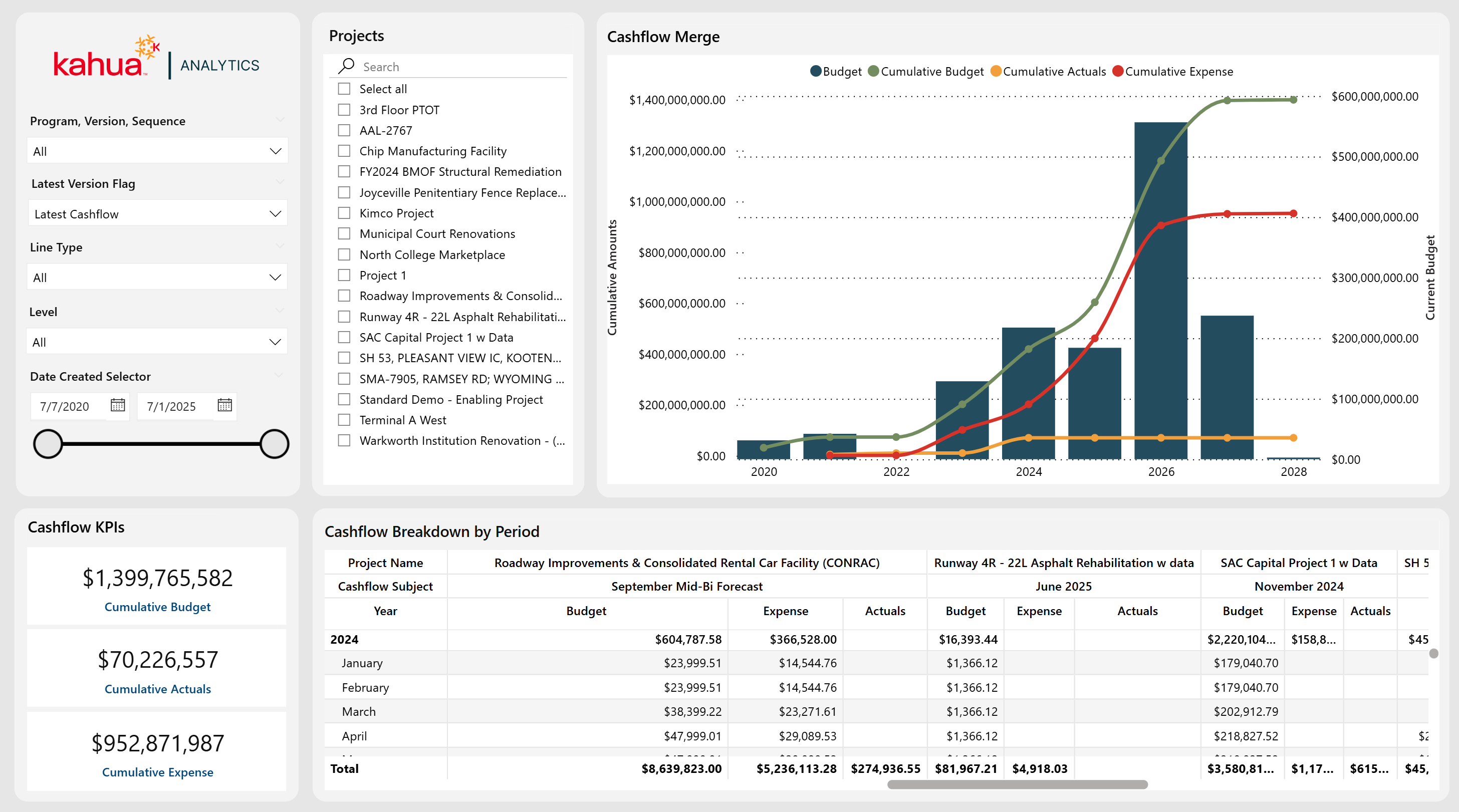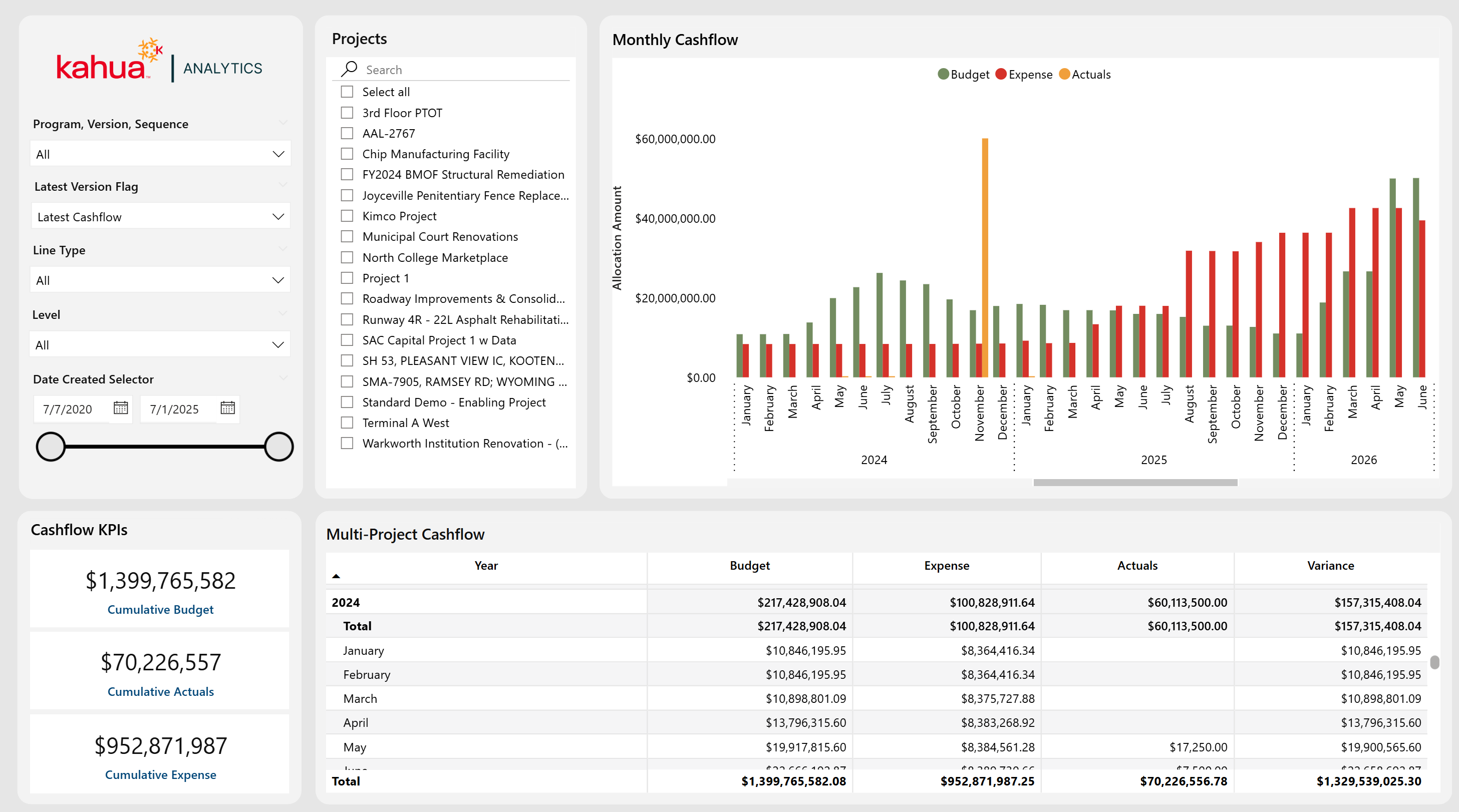The Program Cashflow Dashboard leverages forecasting data to compare planned allocations, actual expenses, and overall budget across many programs and projects. Filters allow selection of a specific cashflow, version, and sequence, enabling scenario experimentation. Through the ability to track cashflow across different allocation periods, users can see how spending aligns with forecasts. They can then make informed decisions to adjust allocations as needed. Users can upload cashflows at either the program or the project level within Kahua, then consume the data in analytics by setting the "level" to view at. Corresponding downstream projects are easy to filter at either level.