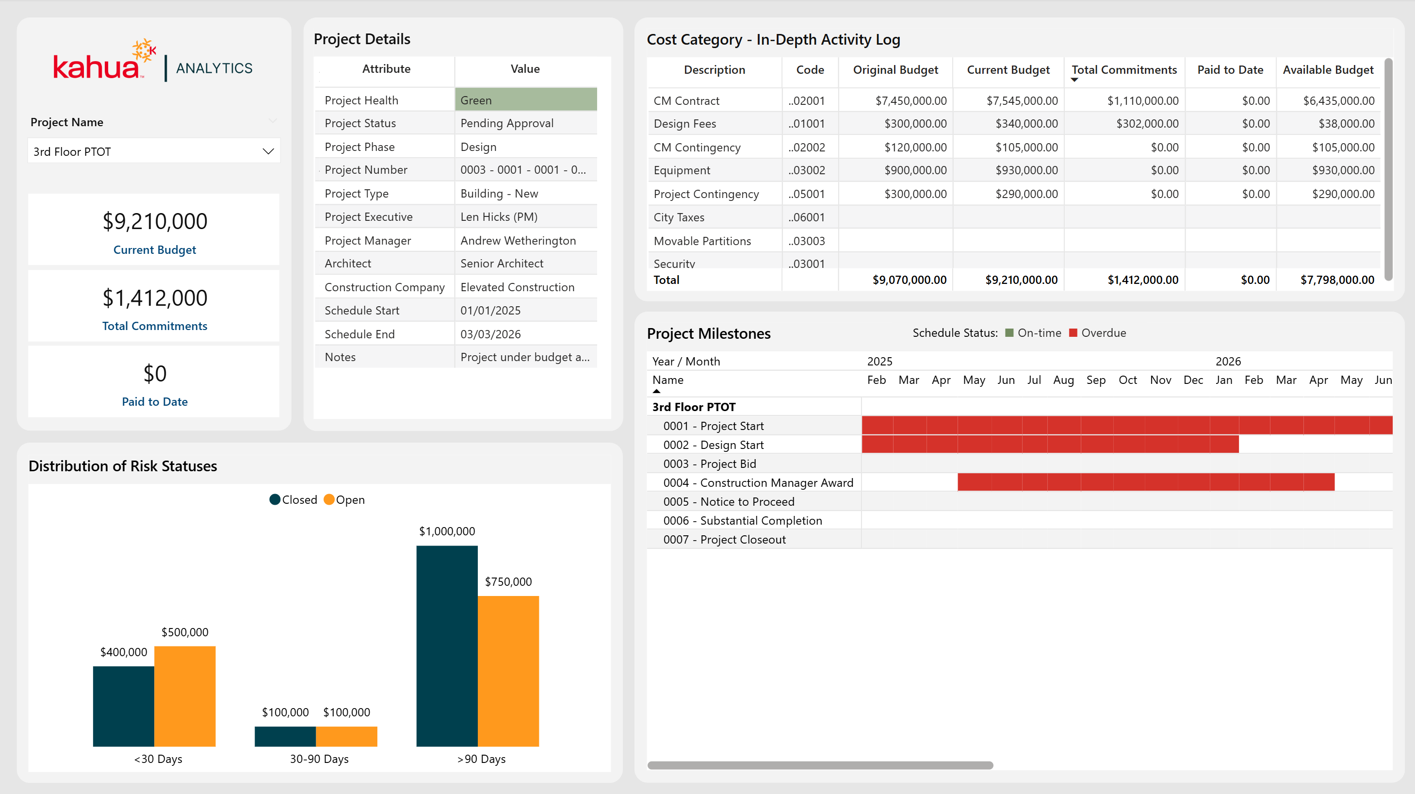 The Kahua Analytics for Owner Package offers a suite of dashboards for keeping track of project costs, health, and timelines.