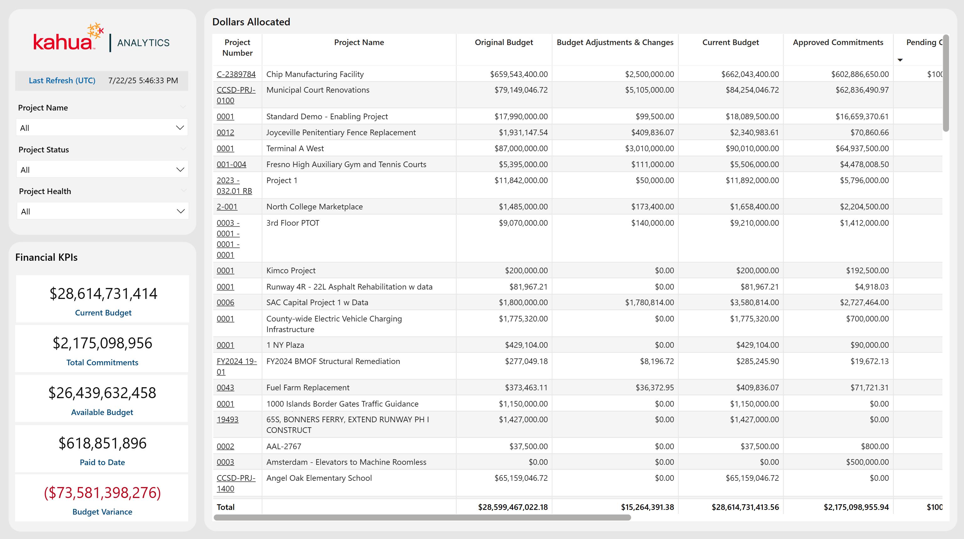 By unifying important financial metrics at the program level, this dashboard helps owners stay ahead of cashflow needs, quickly reallocate funds if necessary, and maintain greater overall confidence in their budgeting decisions.