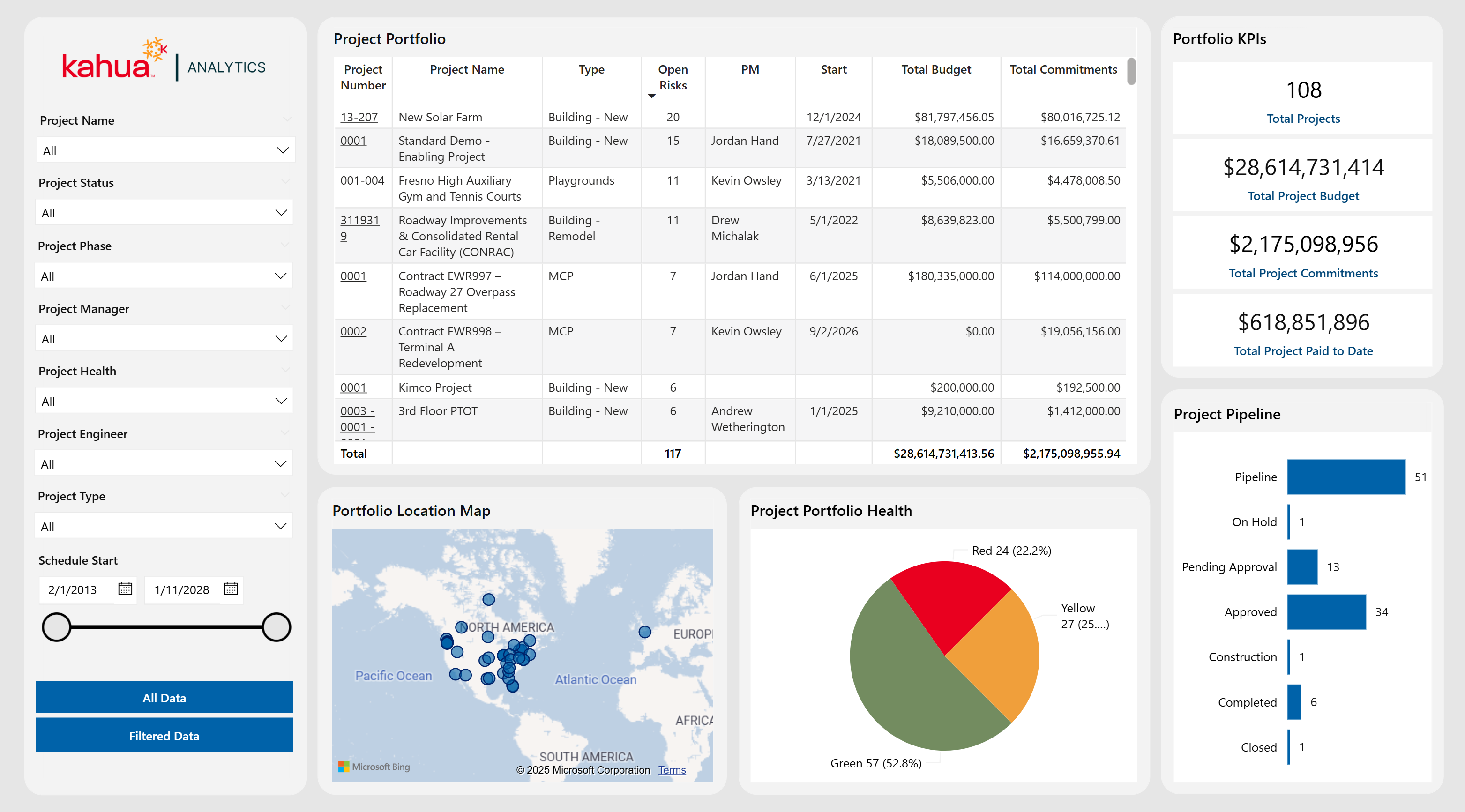The Project General Portfolio Dashboard is a landing page that offers owners a broad overview of their entire project portfolio, focusing on key financial metrics, project status, and geographical spread. Filters allow for quick, targeted analysis by specific project attributes, such as Project Manager, Phase, Type, and Status. Visualizations, such as a funnel chart for status distribution, pie chart for health categorization, a map display of project locations, and a detailed project table, make it easy to assess both high-level trends and granular details.