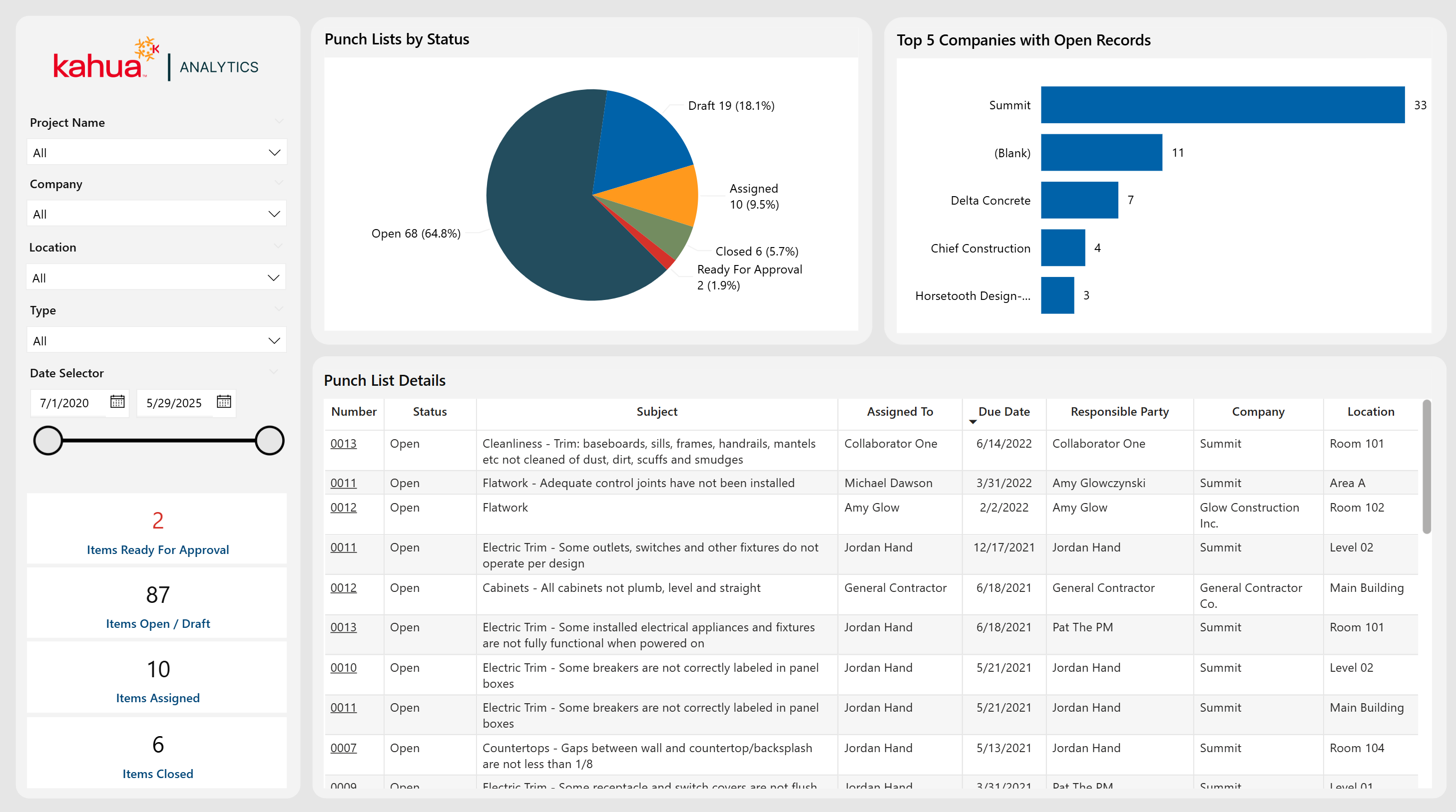 The Punch List Dashboard simplifies project closeout by providing a clear overview of outstanding tasks. Visuals and metrics help to give insight to distribution by status, spotlight top companies with open records, and provide key indicators for items at different workflow stages.