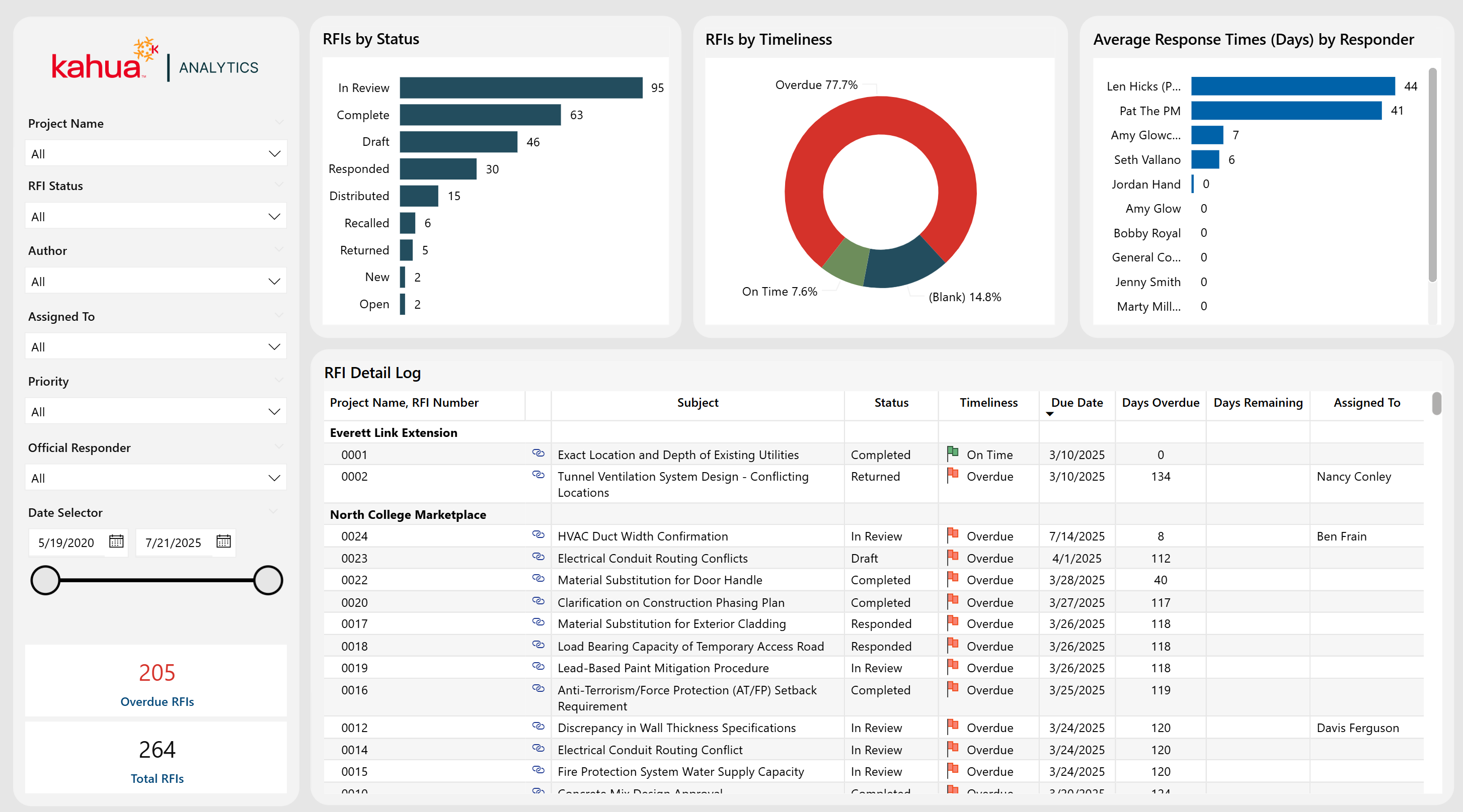 This dashboard serves as a single source of truth for RFI Management, including detailed logs, status charts, and average responder turnaround times.