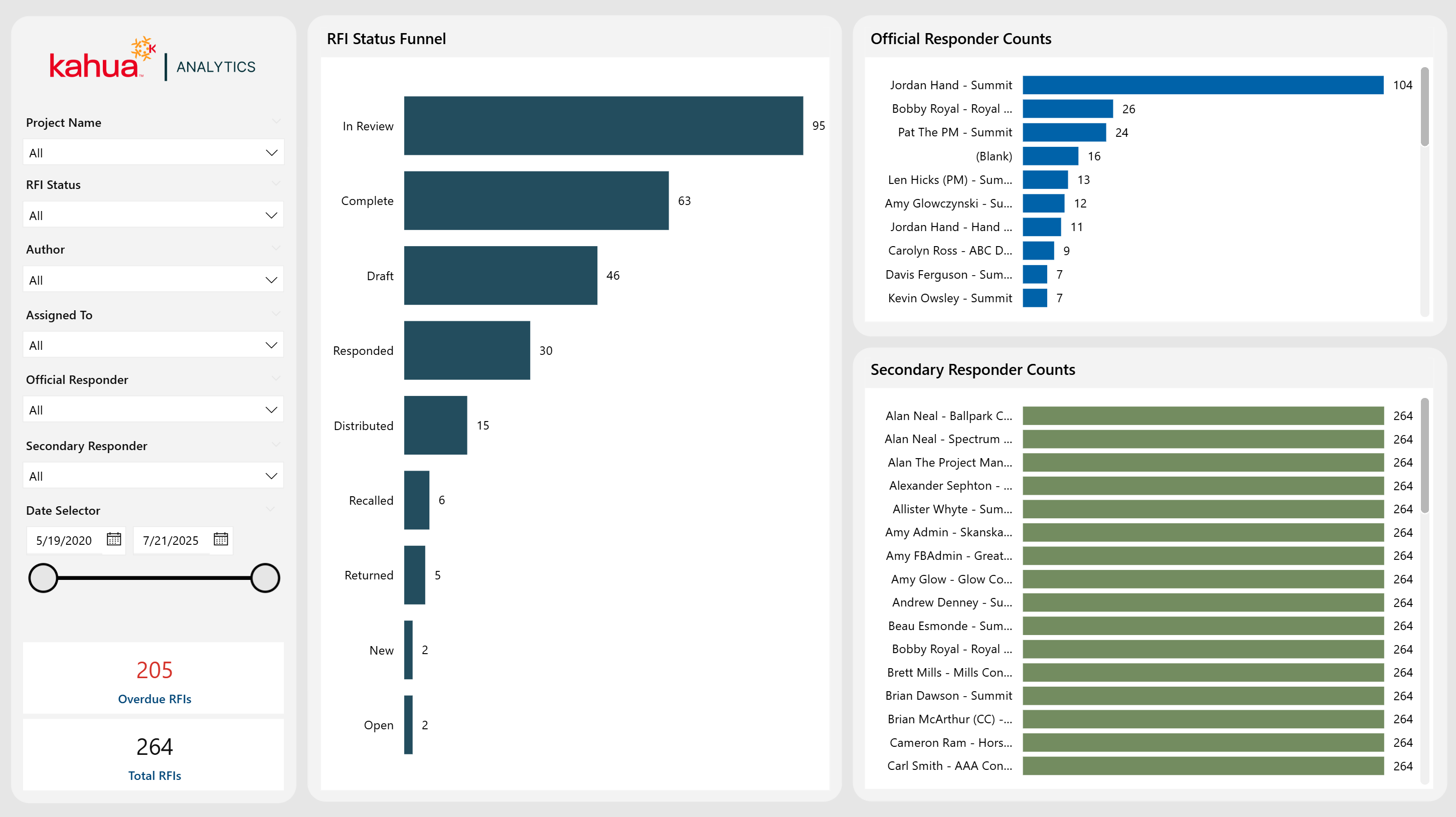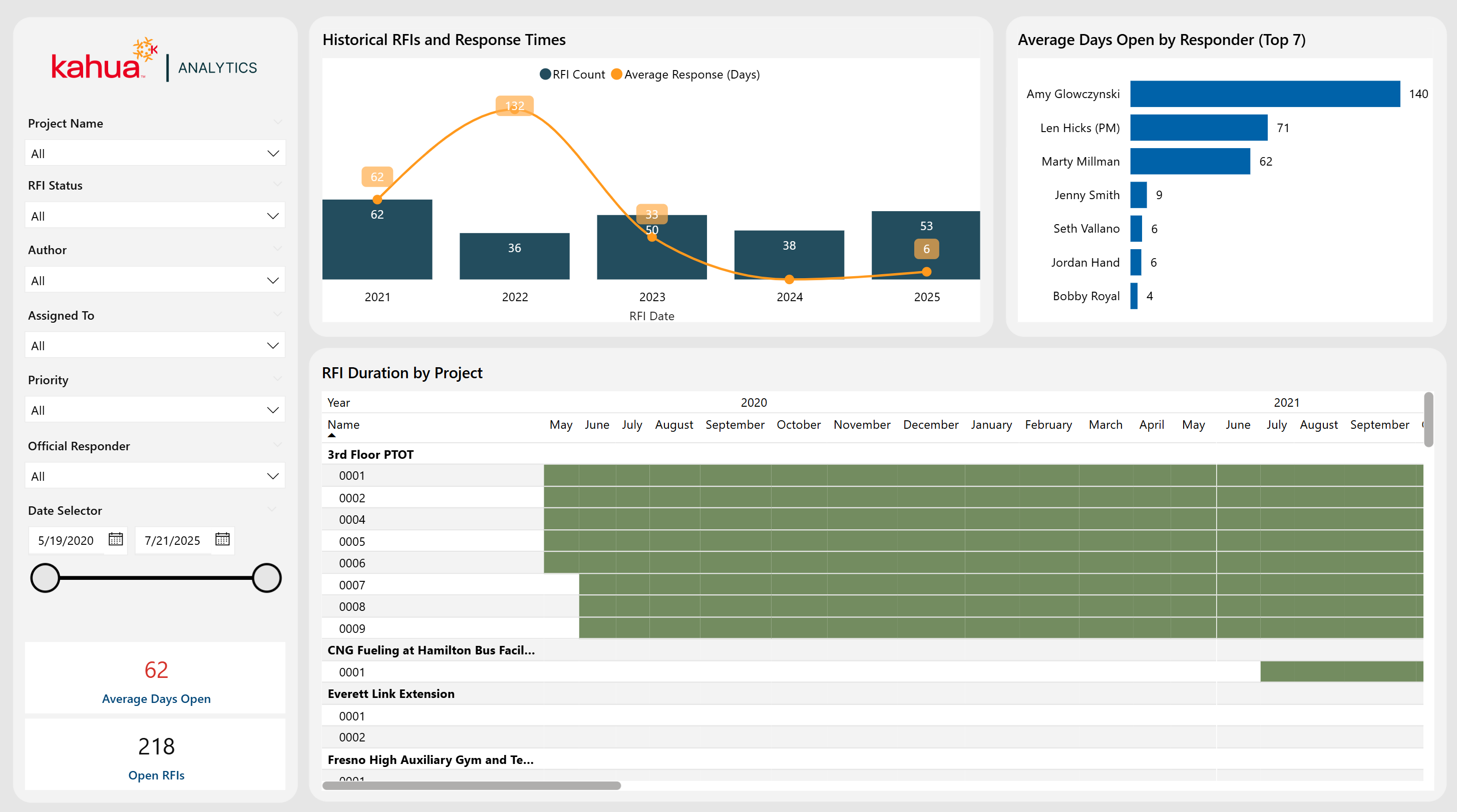 This RFI dashboard is comprehensive and time-line focused. It features monthly trends, responder performance metrics, and a project-level Gantt chart.
