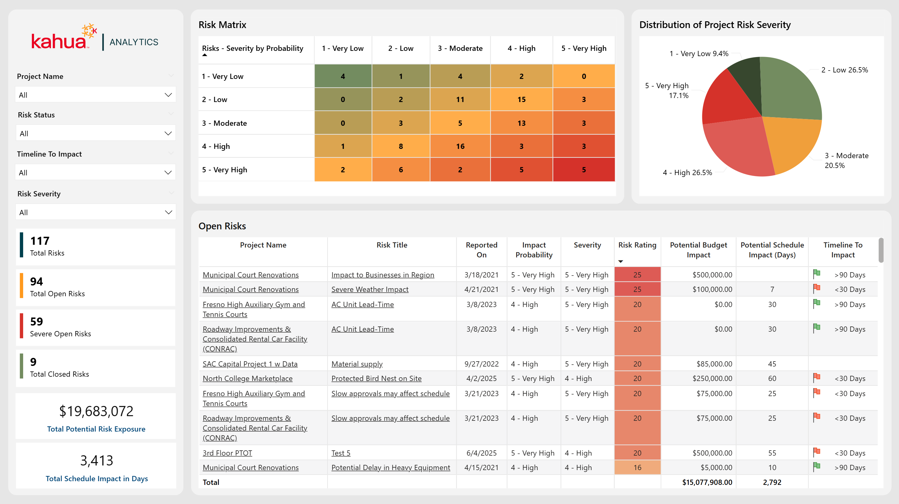 This dashboard provides a focused view of both the volume and severity of project risks, along with their potential financial and schedule ramifications.