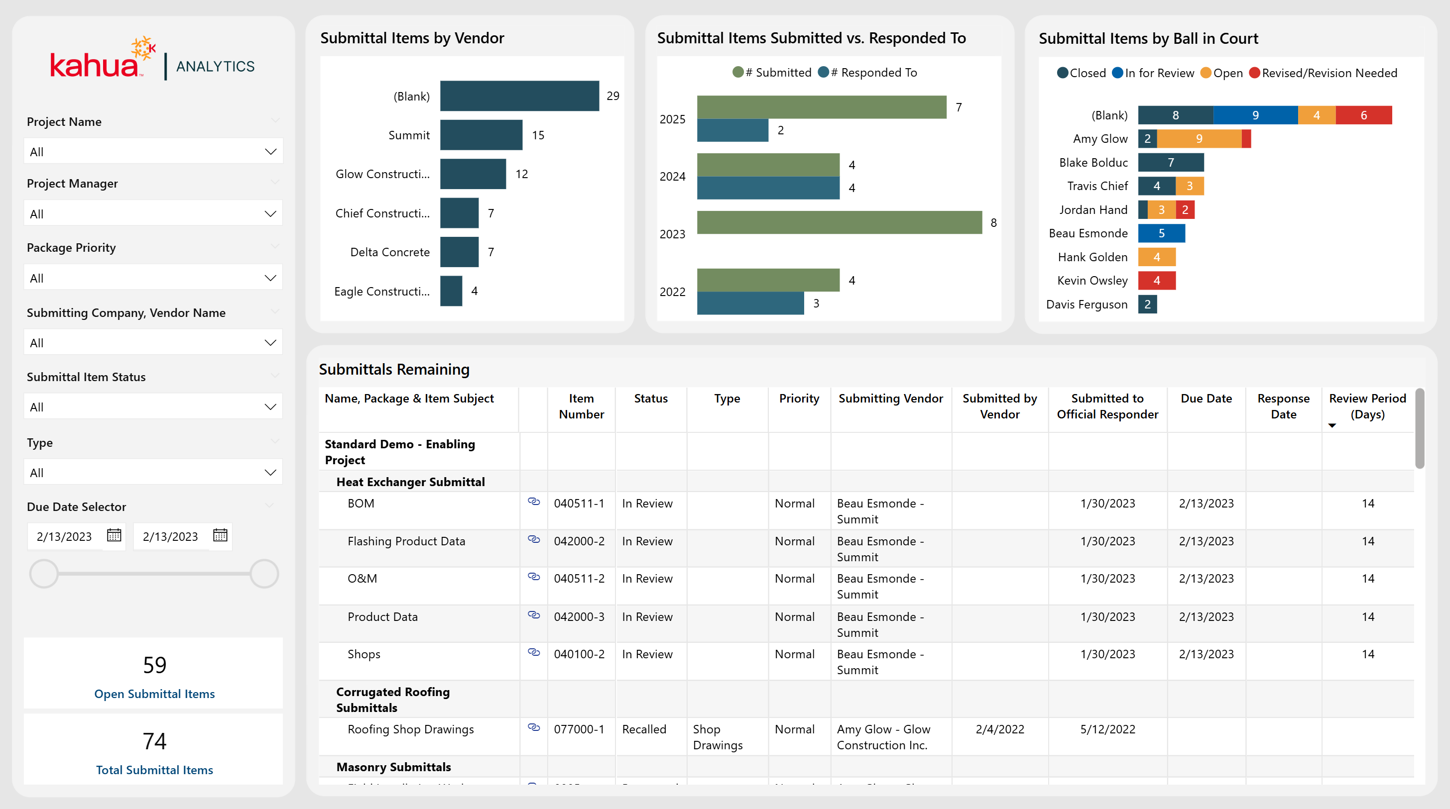 The Submittals Dashboard follows the entire submittal process. It offers visibility into submittal volume, status count by responder, and number of submittals by vendor. In this way, it highlights which vendors are the most active, the number of submitted or responded to over time, and the overall percentage of items completed.