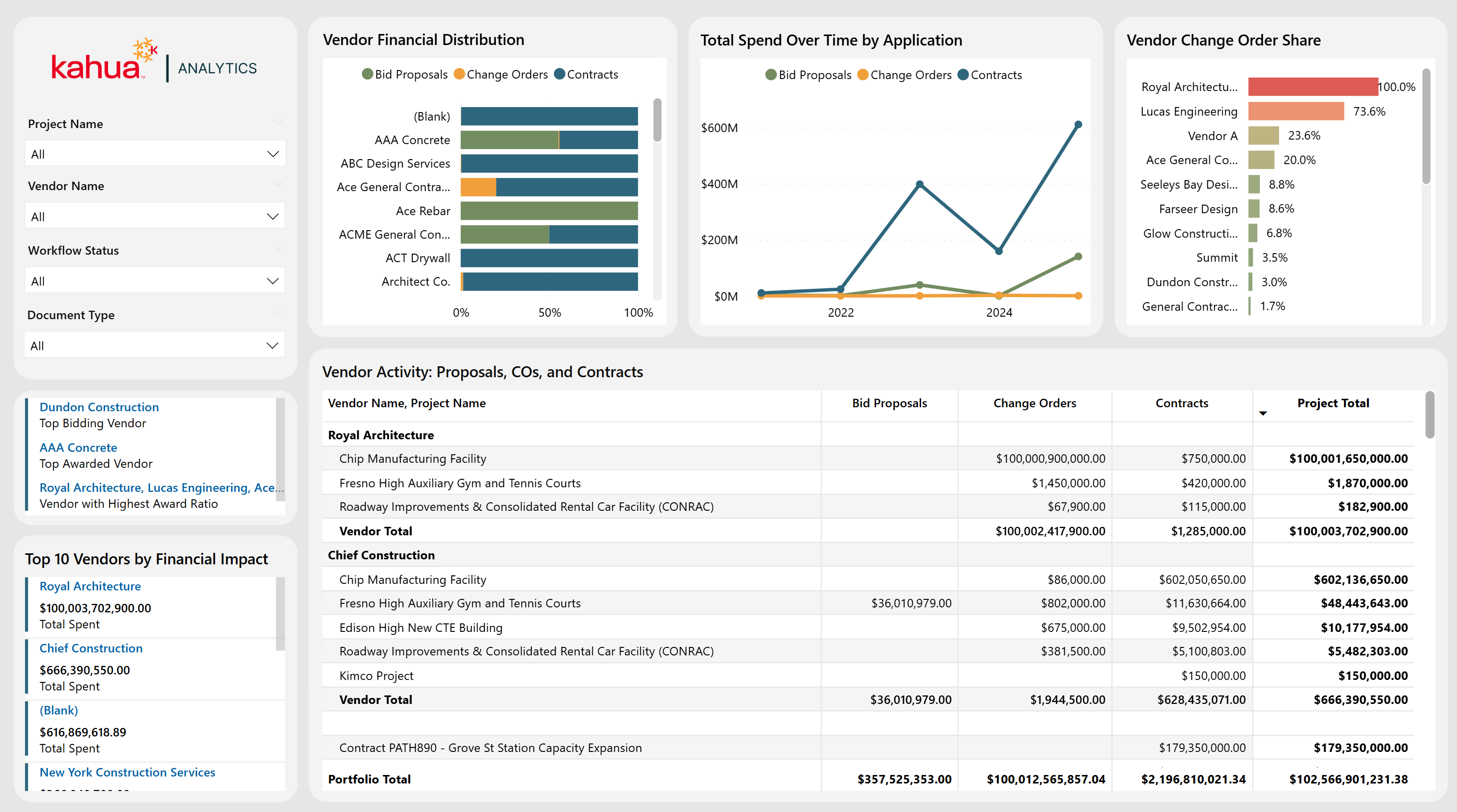 This vendor-centric dashboard consolidates bids, contracts, and change orders into clear, actionable insights.