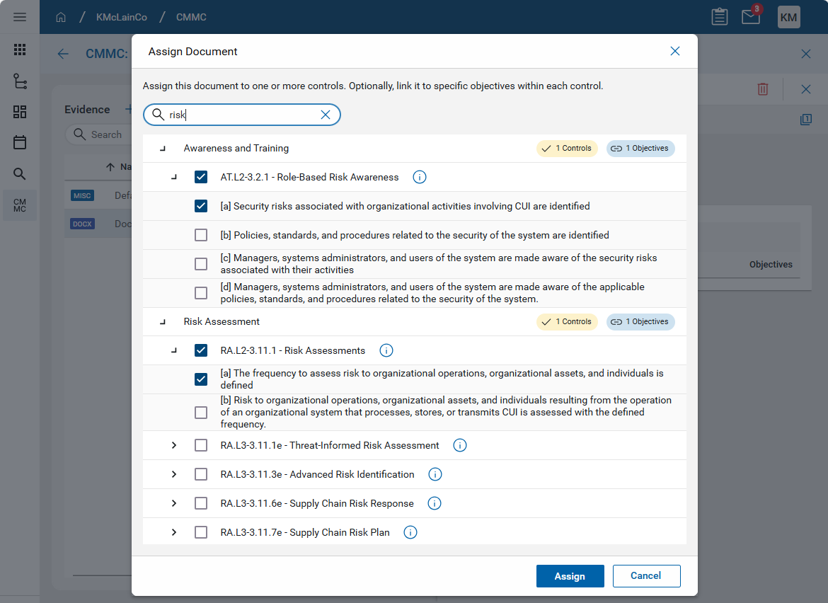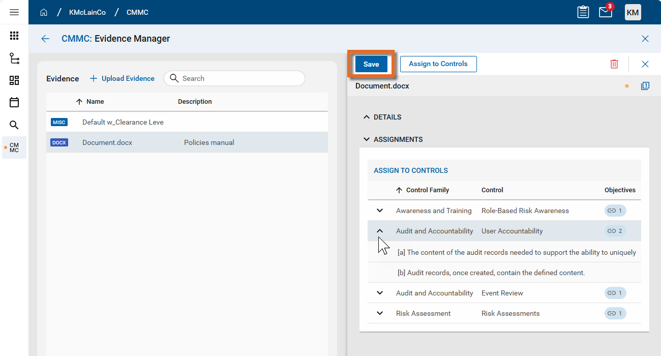To assign the document to additional controls or objectives, click Assign to Controls again and repeat the steps above.