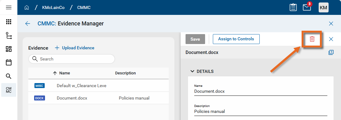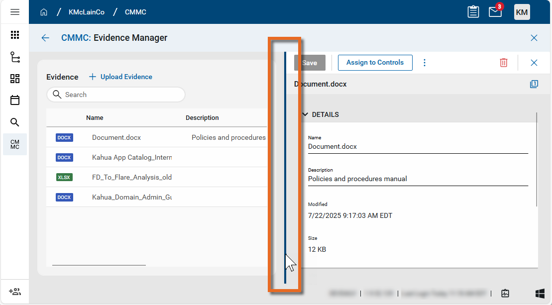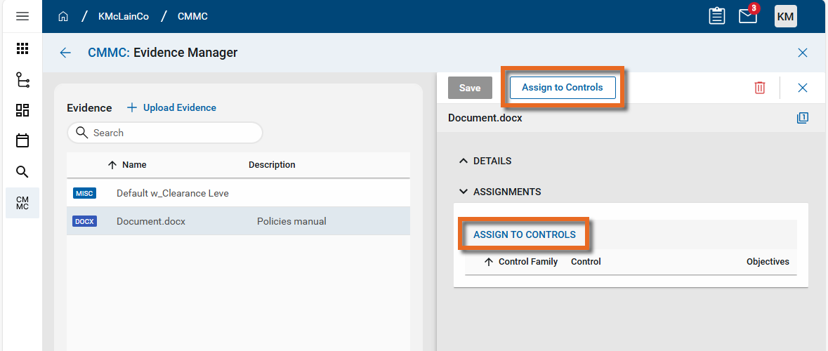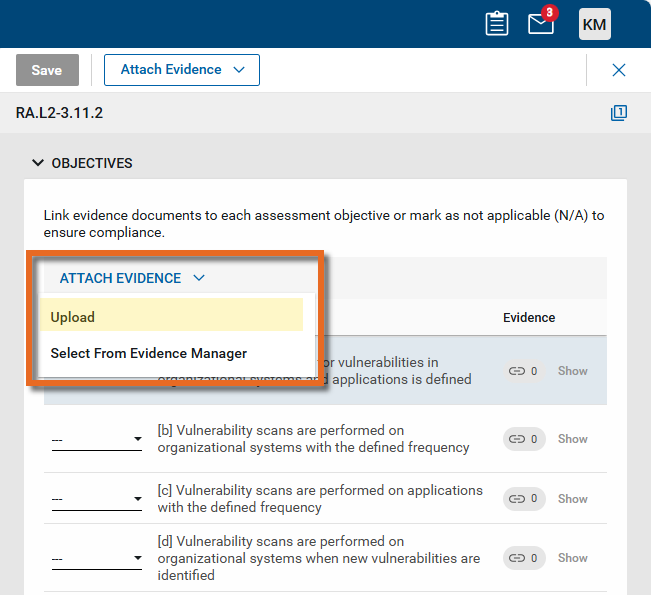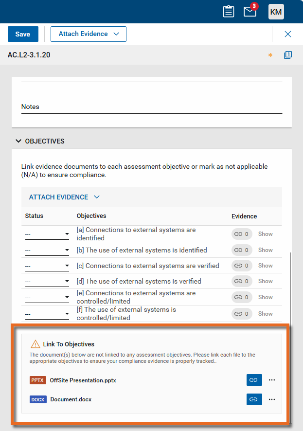 You can associate evidence documents to specific controls or assessment objectives throughout your certification preparation process. Documents can be linked to specific controls or objectives through the Evidence Manager or directly on the control record.