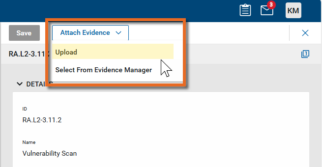 The page for control's record appears. Evidence can be uploaded from one of the following locations: