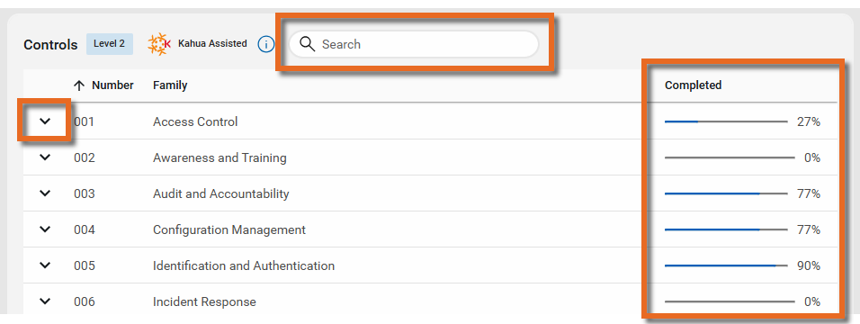 to open a list of the individual controls in each family. For each individual control, you can view the ID number, Name, Due Date, Assigned user, Status, and the number of "Complete" or "Not Applicable" objectives and total number of objectives for that Control item.The Completed column for each Control family shows the percentage of controls set to "Complete" or "Not Applicable" in that family, divided by the total number of controls in that family.