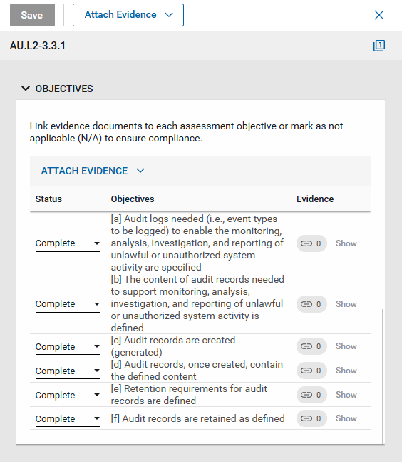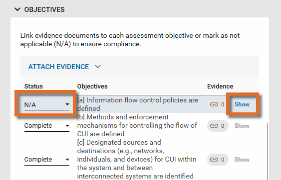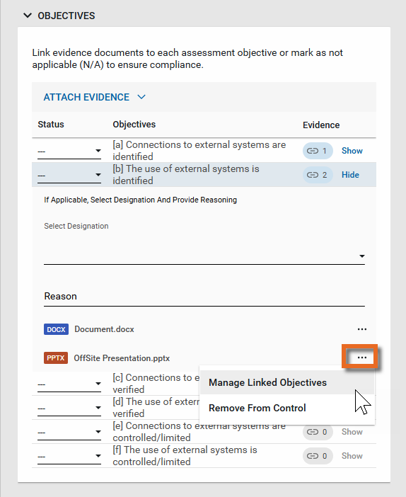 Review the Objectives section. In the Objectives section you can upload evidence and link it to individual objectives, manage the status, select an inheritance designation, and enter a Reason for the inheritance designation or selection of N/A (Not Applicable) for an objective.