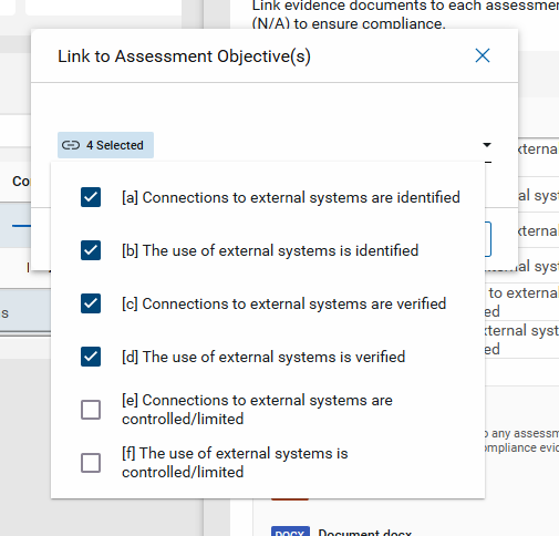 You can upload documents to be used as evidence for individual assessment objectives in a control. A document can be associated with multiple assessment objectives under different controls.