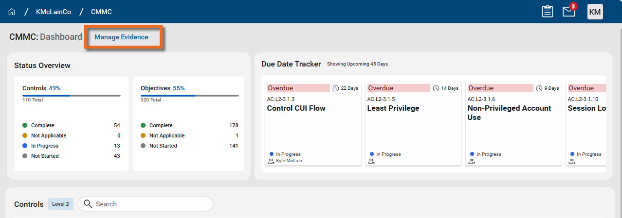 When you open the CMMC app, your dashboard appears. The dashboard is composed of three sections: Status Overview, Due Date Tracker, and Controls. You track your work in the Controls section. The Status Overview and Due Date Tracker show you how far along you are in the process and what components are overdue or are coming due.