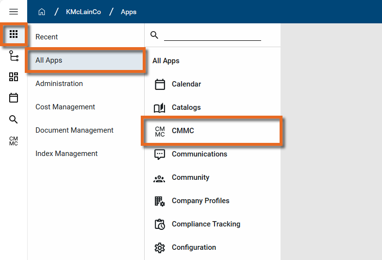 Log in to Kahua and open the CMMC app by navigating to Apps > All Apps > CMMC.