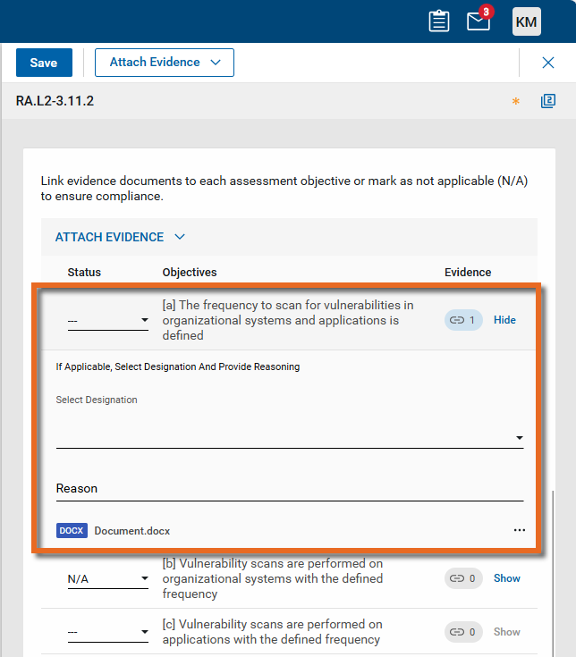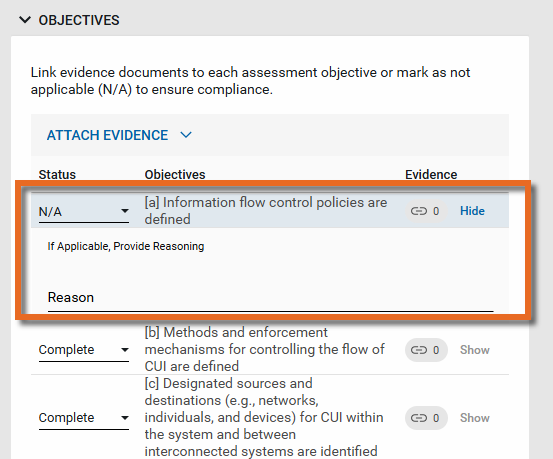 Important When marking a Control or Objective as N/A, CMMC Third Party Assessor Organizations (C3PAO) will look for a provided reason for that designation. We recommend you utilize the Reason field within the Control Form when marking Controls or Objectives as N/A.