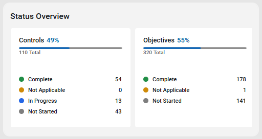 Objectives - Objectives are the milestones your organization will be assessed against. They are sub-components of each control. Objectives progress allows you to track your certification preparation at a more granular level. The percent complete represents the number of objectives set to "Complete" and "Not Applicable", divided by the total number of objectives. Below that percentage, the individual numbers of "Complete", "Not Applicable", and "Not Started" objectives are shown.