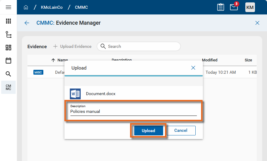 Complete the upload process as described above. When uploaded from a control, the document is automatically associated with that control. The document can also be reviewed and managed in the Evidence Manager.