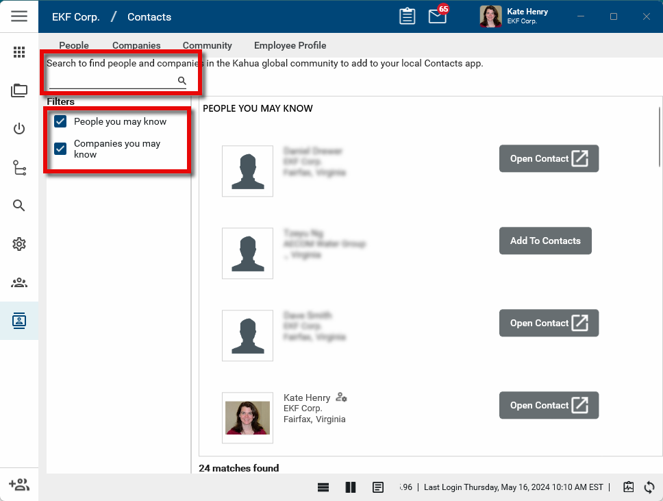 To search for contacts or companies in the Kahua Community, complete the following steps:
