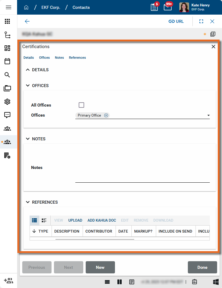 for the line item to enter or view more details about the certification. You can add a URL, select an office to apply the certification to, and attach or manage reference files, such as a PDF copy of the certificate. For more information on using the References section, refer to References section.For more information on working with grids, refer to Item Grids.