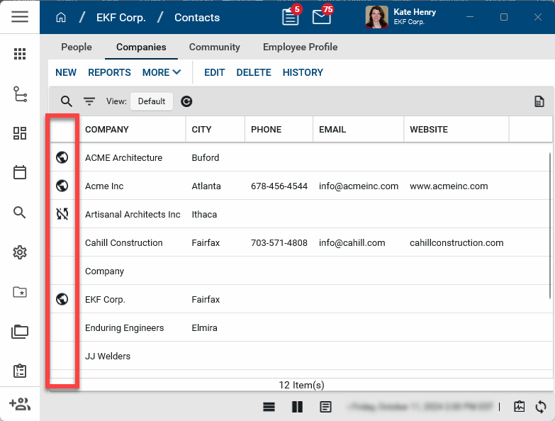 The first column in the default log view is the Community Status column. The icons in this column indicate if the company record in your Companies sub-app is from the community