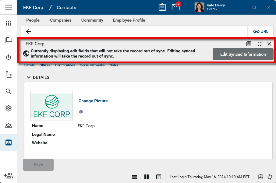 . Only fields that will not take the record out of sync from the Community record will appear for editing. To edit synced information, select Edit Synced Information. Important Selecting Edit Synced Information will create a local copy of the company's record in your domain. If changes are made to the company's record in the Kahua Community, your domain will not receive those updates.