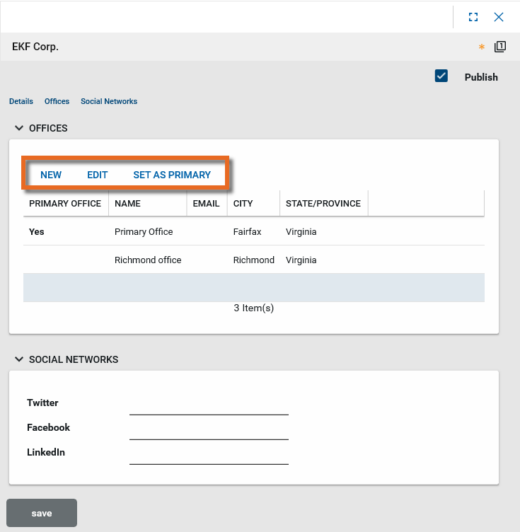 You can add information on additional offices in the Offices section. You will be able to specify which office your users are associated with. To create a new record, click New. Complete the address and other fields and click Done when you are finished. To set a new office as the primary office location, select it and click Set as Primary.