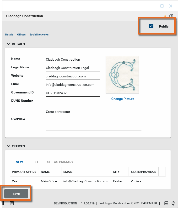 To make this company information available to the Kahua Community, select Publish. This makes your company information visible to other Kahua users in the Kahua Community. Only users with Kahua accounts can view your profile.