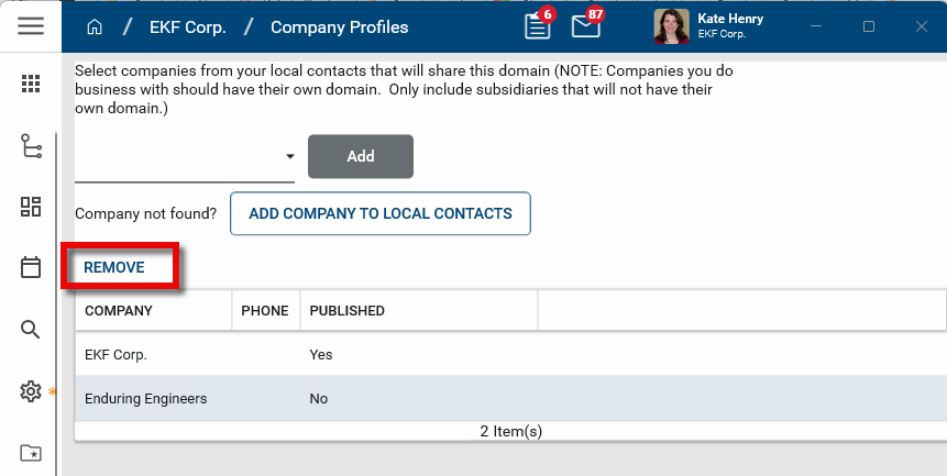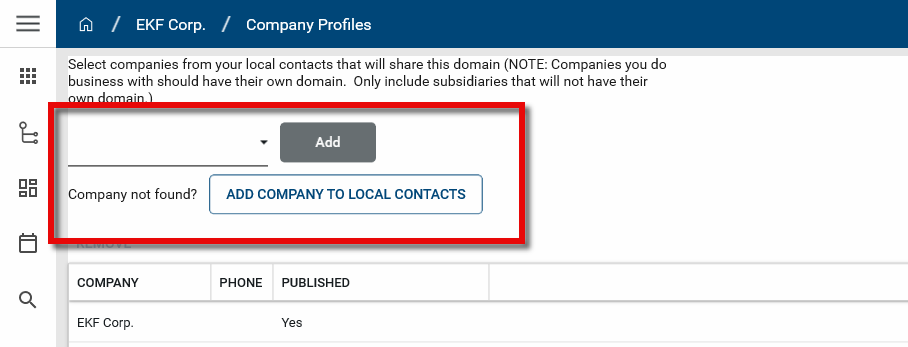 Note Other companies that you do business with, including those that may have their own Kahua domains, are managed in the Contacts app. For more information, refer to Using the Companies app.
