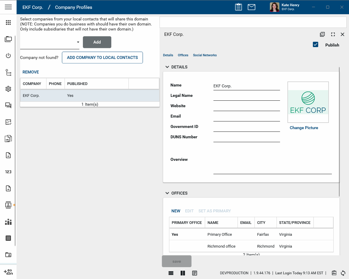 The Company Profiles app is where your company information and information for your affiliated companies, such as your subsidiaries, is stored. You can publish your information to the Kahua Community, allowing other Kahua users to collaborate with you. This is also where you can upload your logo to make it available for reports.