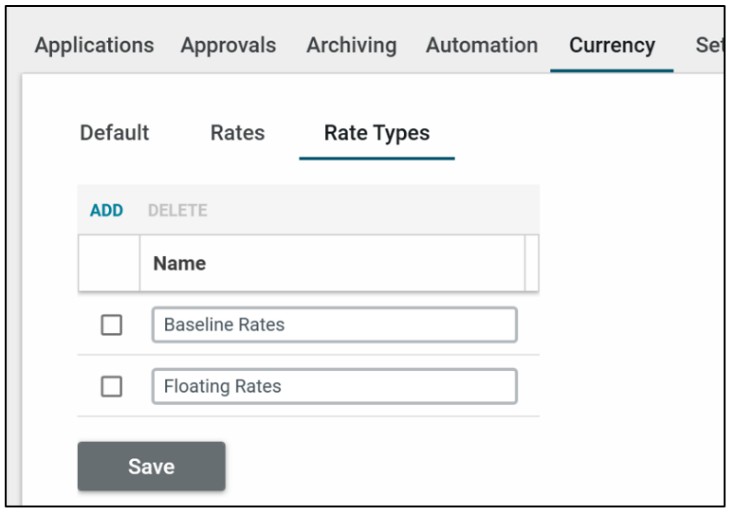 Your domain comes with an initial rate type. This initial rate type is used as the baseline rate. On the Rates tab, you can establish the baseline exchange rates using that rate type. This rate type cannot be deleted, but its name can be edited on the Rate Types tab.