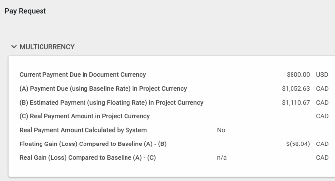 The Multicurrency section on pay applications, pay requests, and invoices when the contract is a different currency than the project.
