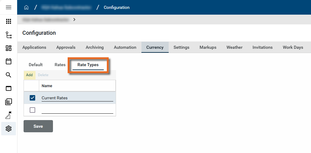Important When a project is set up, the Configuration app > Currency tab > Rates sub-tab should be set to Override before any cost documents are created. If it is not, you will be unable to edit baseline rates at the domain or program level once cost documents are created in the project.