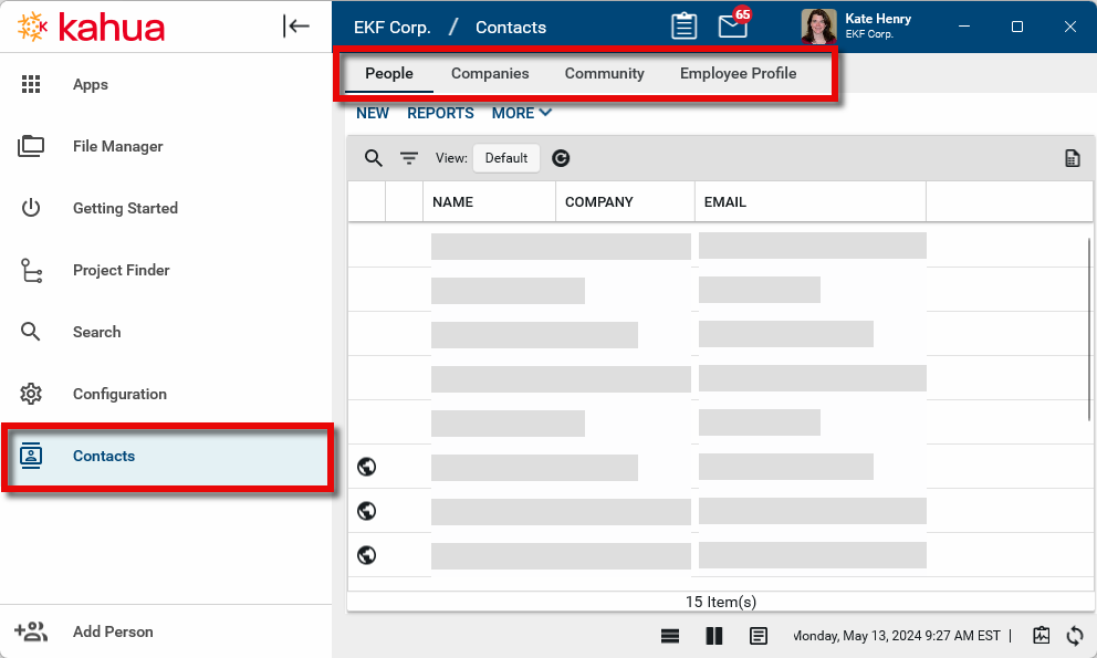 People: The People app is a domain-wide list of contacts. It is not project-specific. People in this list could be Kahua users or non-users. They represent all the contacts that your company will engage with on a project, including all internal and external users. If you want to add a person to any Kahua record, they must appear here on the people list. This includes internal users, external users, users in the Groups app, project directory lists, and employees on the Employee Profile app. For more information, refer to Using the People application.
