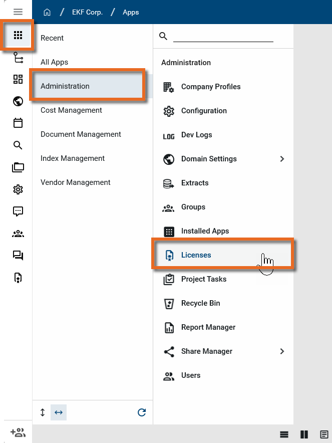 Navigate to the Licenses app (All Apps > Administration > Licenses).