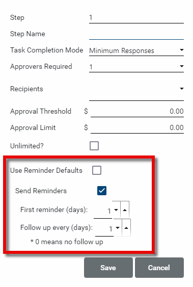 Recipients Select the appropriate recipients. You can select Roles as defined on the Approvers tab, Actors as defined on the Project Information page or the record itself, or non-system groups from the Groups app. Approval Threshold Approval Limit Unlimited Use Reminder Defaults Select this option to use the reminder defaults established in the previous step. Clear this option to not use the reminder defaults.