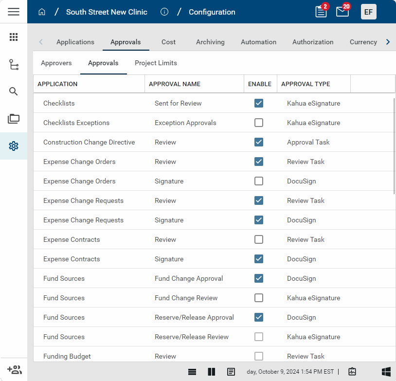 The Approvals sub-tab will contain a list of applications and the type of approvals available for configuration. There are potentially multiple approval types available to be configured for each application, such as Review or Signature.