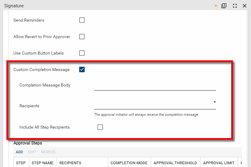 Custom Completion Message Select this option to replace the body of the message sent upon completion to the initiator of the review or approval process with a custom message.